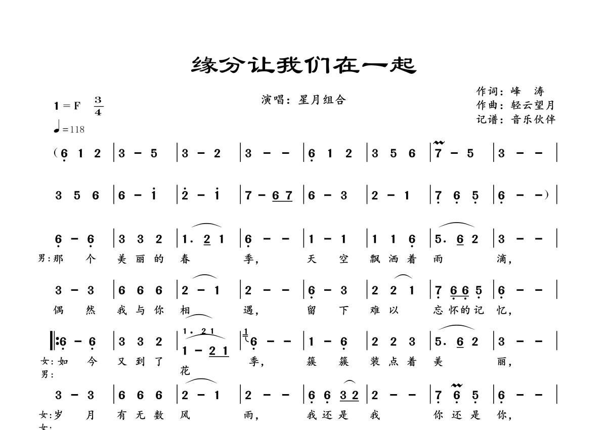 曲谱介绍: 星月组合《缘分让我们在一起》,音乐伙伴编配出品,共有1张高清图谱,免翻页排版设计。