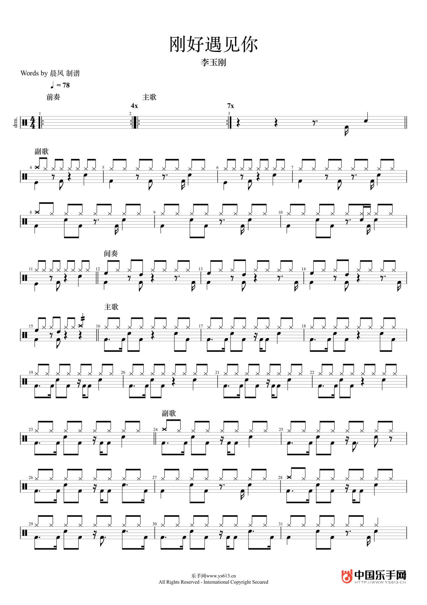 刚好遇见你鼓谱 - 李玉刚 - 架子鼓谱