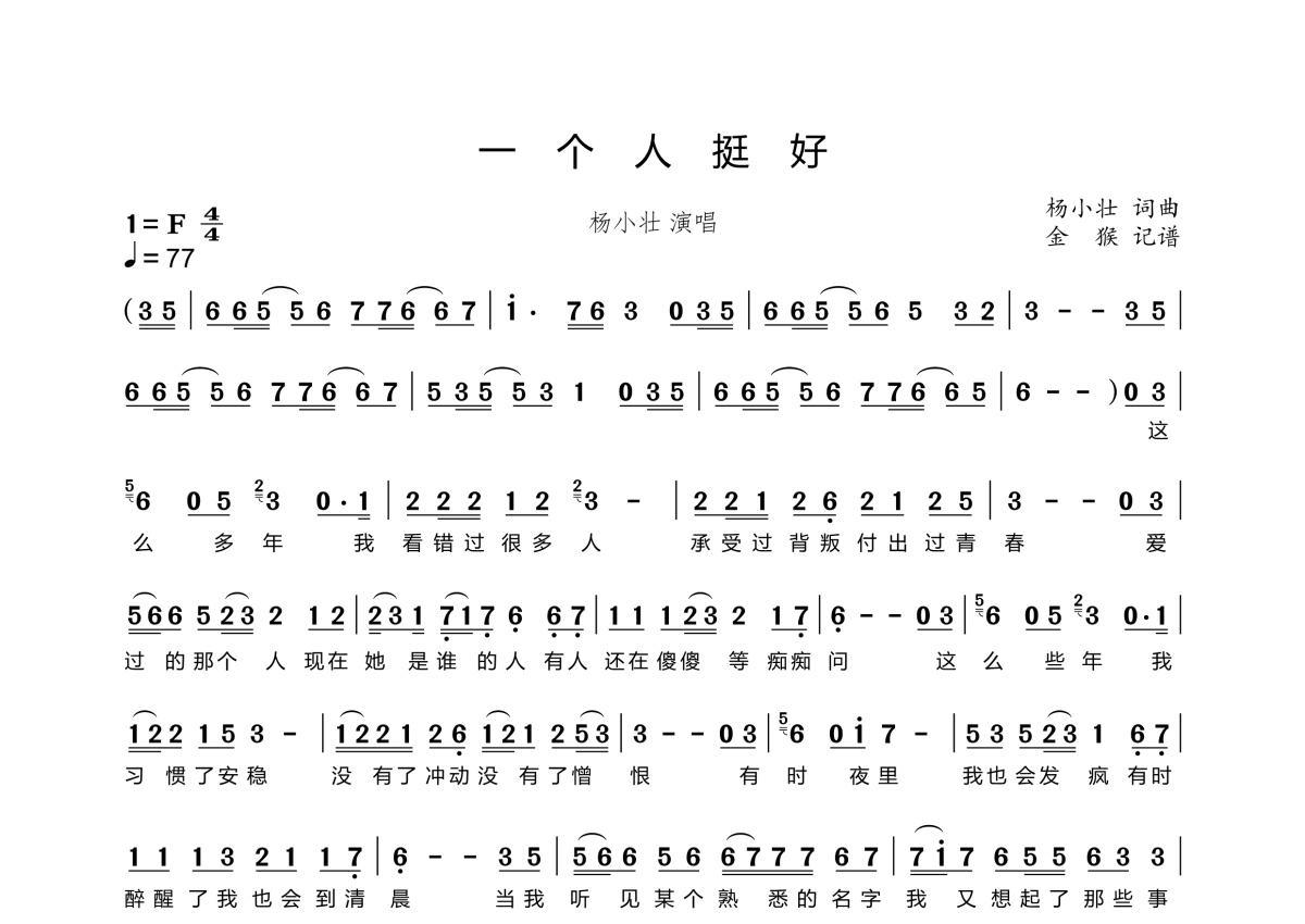 曲谱介绍: 杨小壮《一个人挺好》,金猴奋起千钧棒编配出品,共有2张高清图谱,免翻页排版设计。