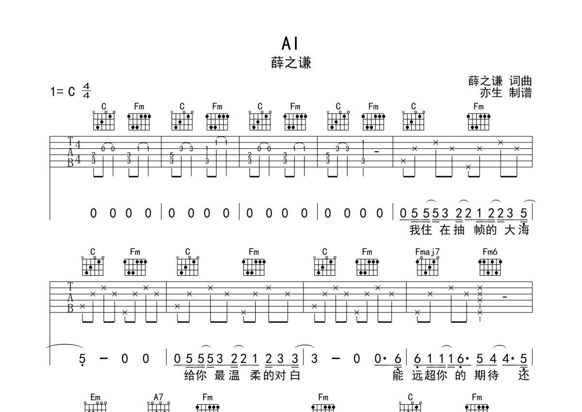 曲谱介绍: 薛之谦《AI》吉他弹唱谱,采用C调指法编配,亦生编配出品,共有4张高清图谱。
