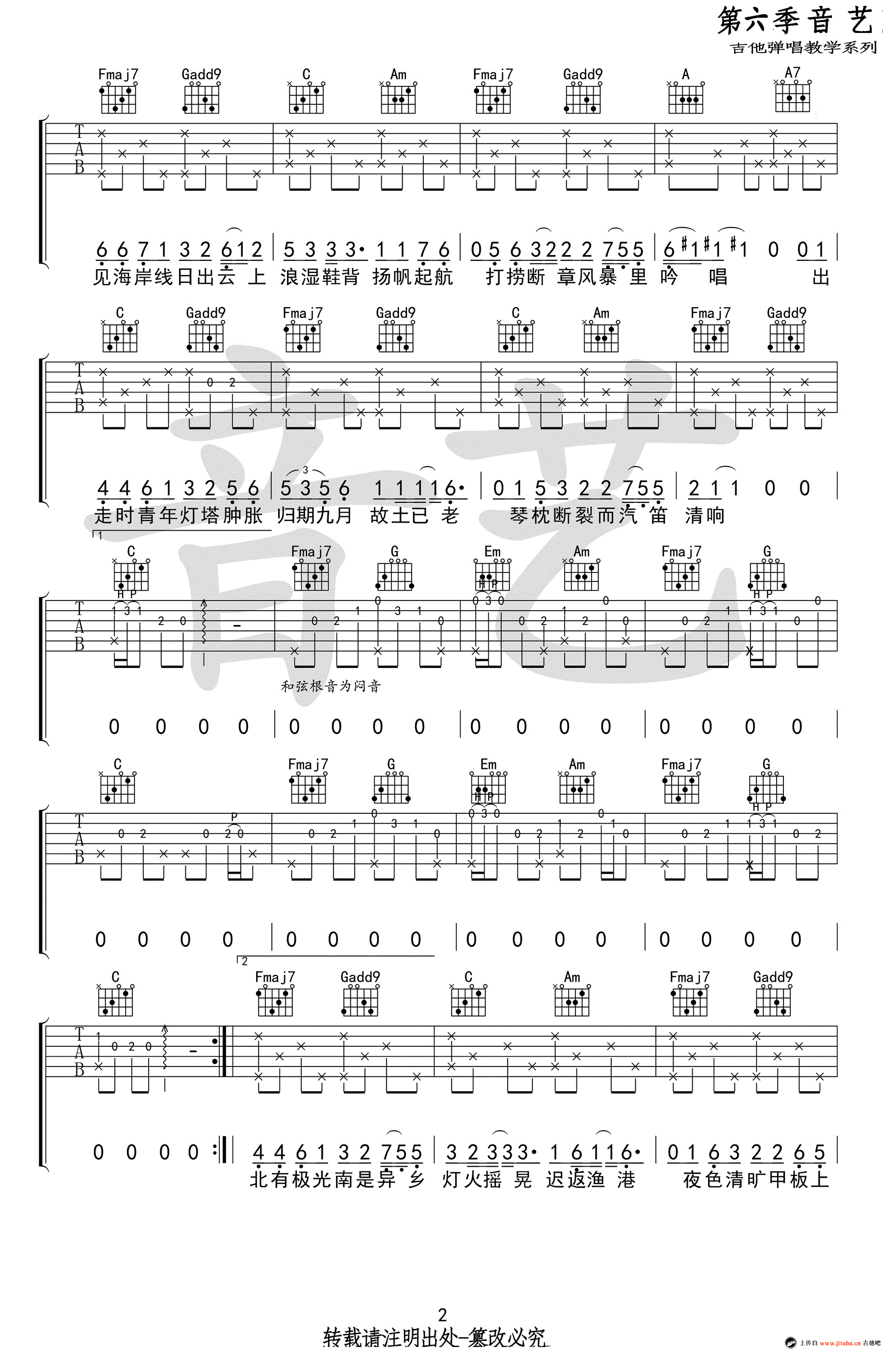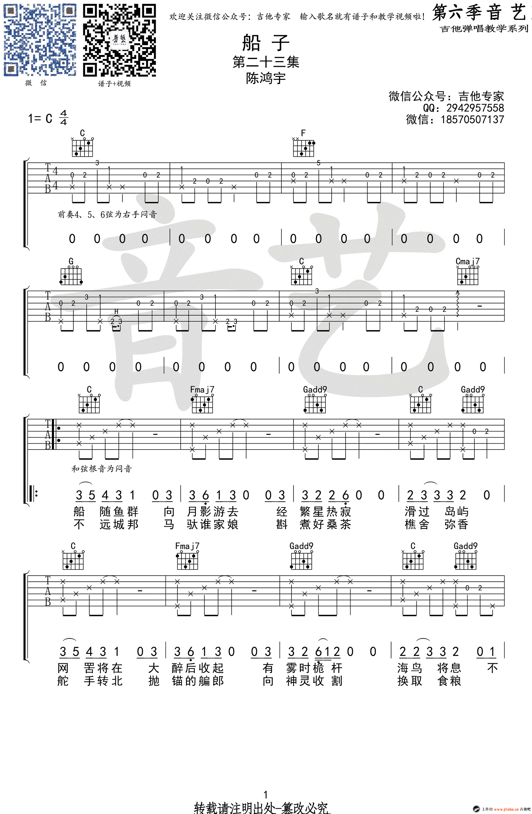 曲谱介绍: 船子吉他谱,陈鸿宇演唱,一首民谣歌曲吉他弹唱谱,船子吉他六线谱,原版编配,C调指法,三张高清图片谱。音艺吉他教学出品,91吉他谱网站上传。 放歌于野,行游于市,一名草原少年之于海的想象。 ​唐映枫大神作词的歌,这首歌配上陈鸿宇的声音真是绝了。