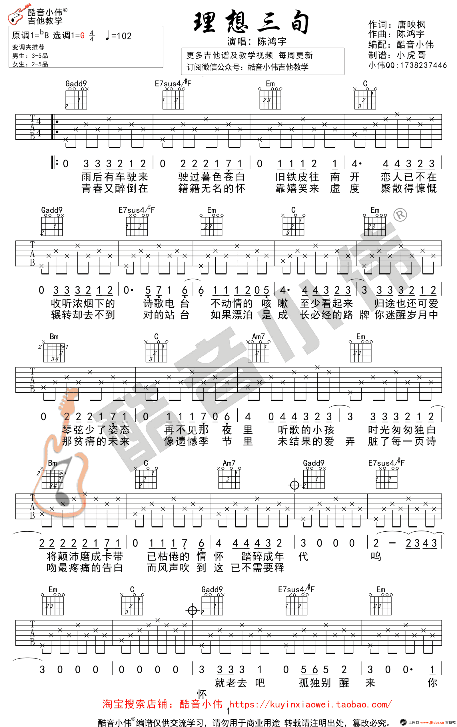 曲谱介绍: 陈鸿宇《理想三旬》吉他谱,G调指法,变调夹位置推荐男生3-5品,高清弹唱谱。理想三旬吉他六线谱,琴友们可以参照小伟老师的弹唱教学视频,学习掌握歌曲弹奏的和弦指法以及四种右手分解节奏型。