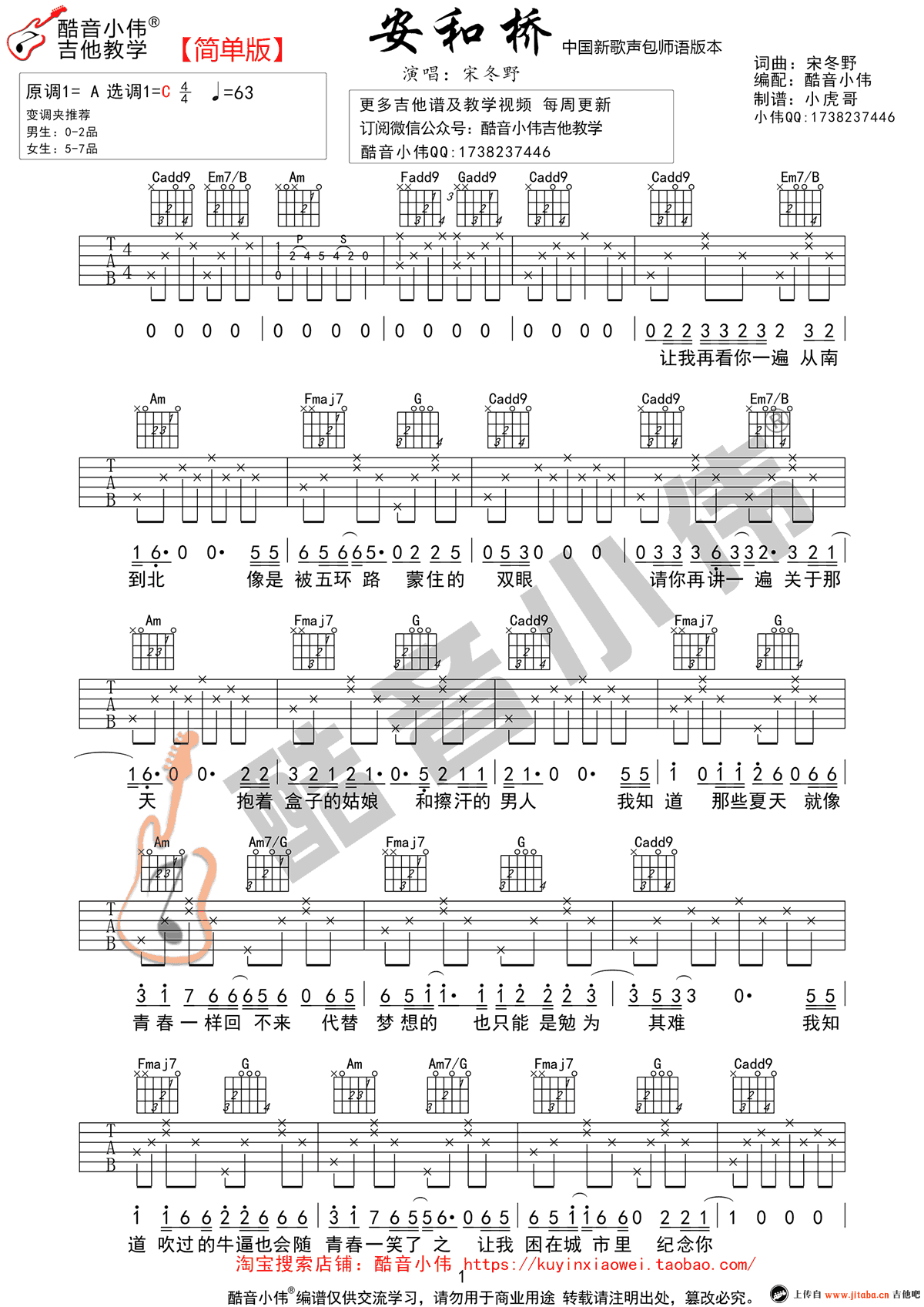 曲谱介绍: 安和桥吉他谱,C调简单版,中国新歌声包师语版本,安和桥六线谱,变调夹推荐,男生0-2品女生5-7品。宋冬野的一首原创民谣代表作品,酷音小伟编配制谱,91吉他谱网站整理上传。 淡淡清新自然不同于老北京胡同汉子的感怀与忧伤,每次这个旋律一响起来就会让我想起许多回忆,那些辛酸的和快乐的……