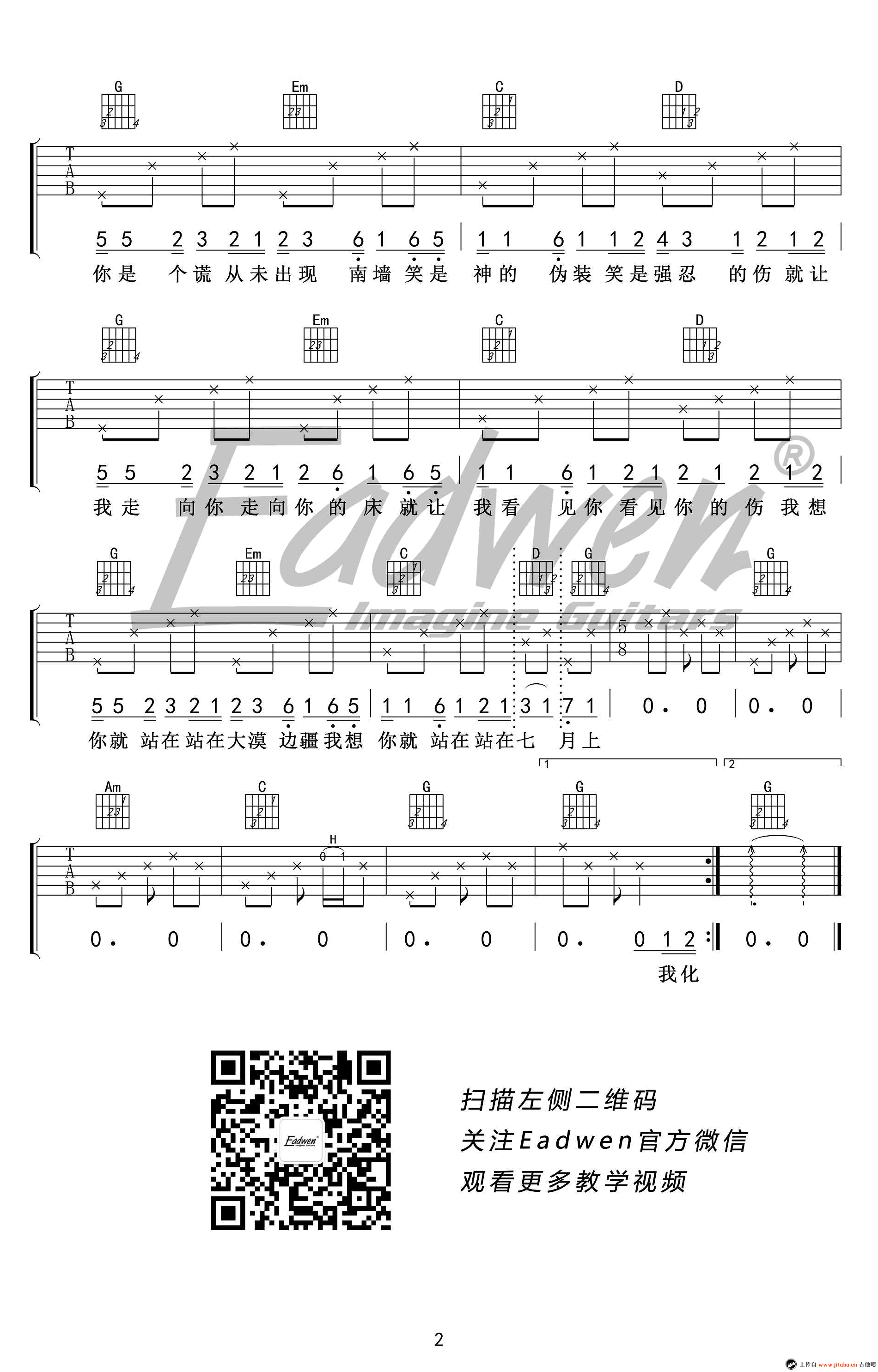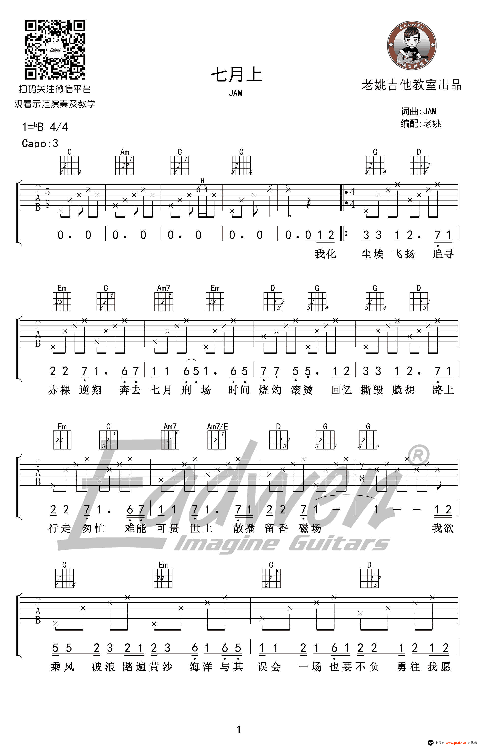 曲谱介绍: 七月上吉他谱,Jam的一首原创民谣歌曲,吉他简单版本编配,适合吉他初级琴友们,七月上六线谱,高清弹唱谱,G调指法,变调夹夹三品,两张图片谱例。感谢老姚带来《七月上》吉他弹唱教学视频,91吉他谱网站上传推荐。