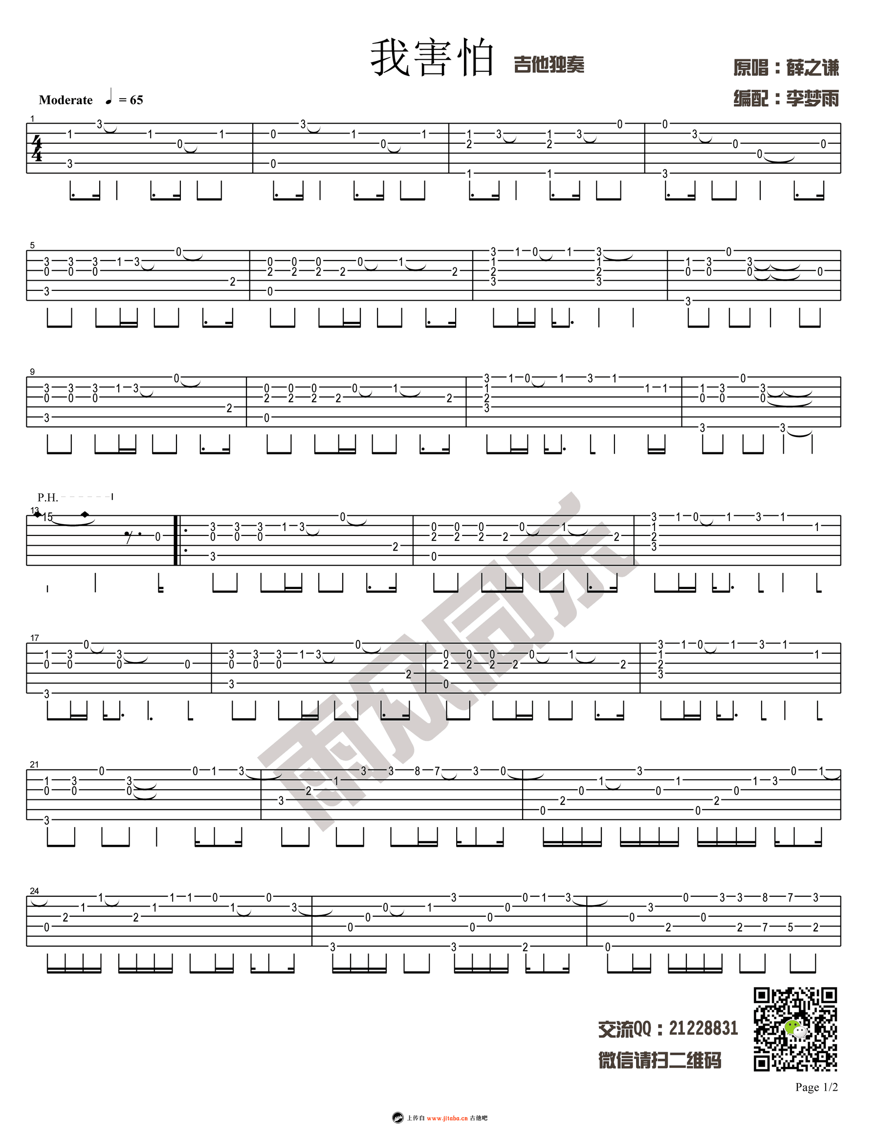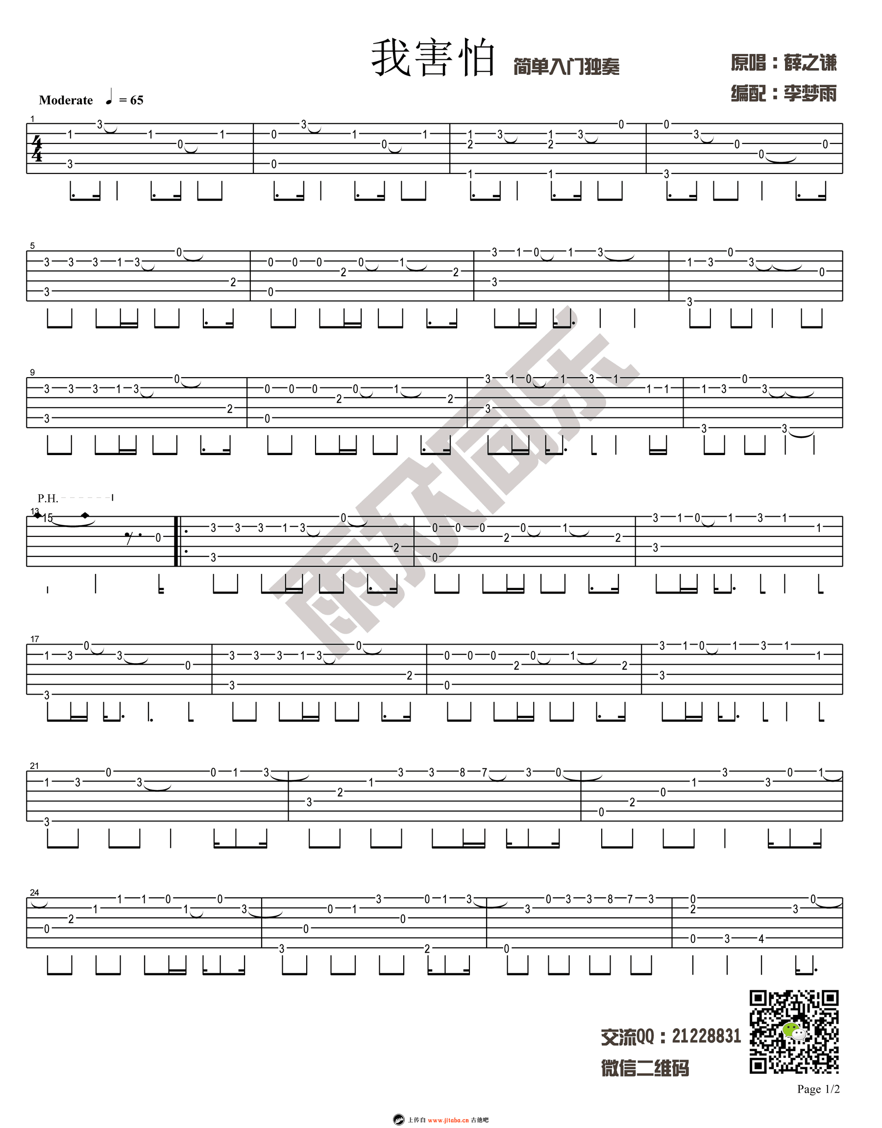 曲谱介绍: 薛之谦《我害怕》指弹吉他谱,两个版本,其中一个是适合吉他初学者的《我害怕》简单入门吉他独奏谱。琴友们选择练习。感谢雨众同乐出品李梦雨编配,91吉他谱网站上传推荐。