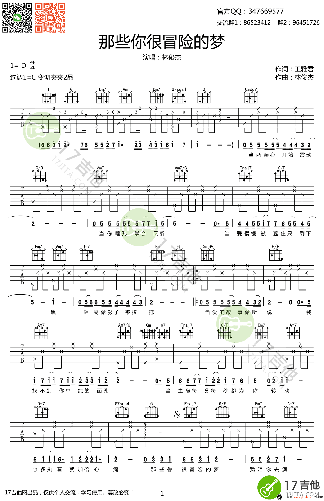 曲谱介绍: 林俊杰《那些你很冒险的梦》吉他谱,原调D,弹奏时选用C调指法,变调夹夹2品位置。那些你很冒险的梦六线谱,高清弹唱谱,两张图片谱子。 心有多执着就有多悲痛,JJ的一首弥漫着幽幽哀伤的情歌,关于那些逝去的爱,那些再也回不去那些美梦。