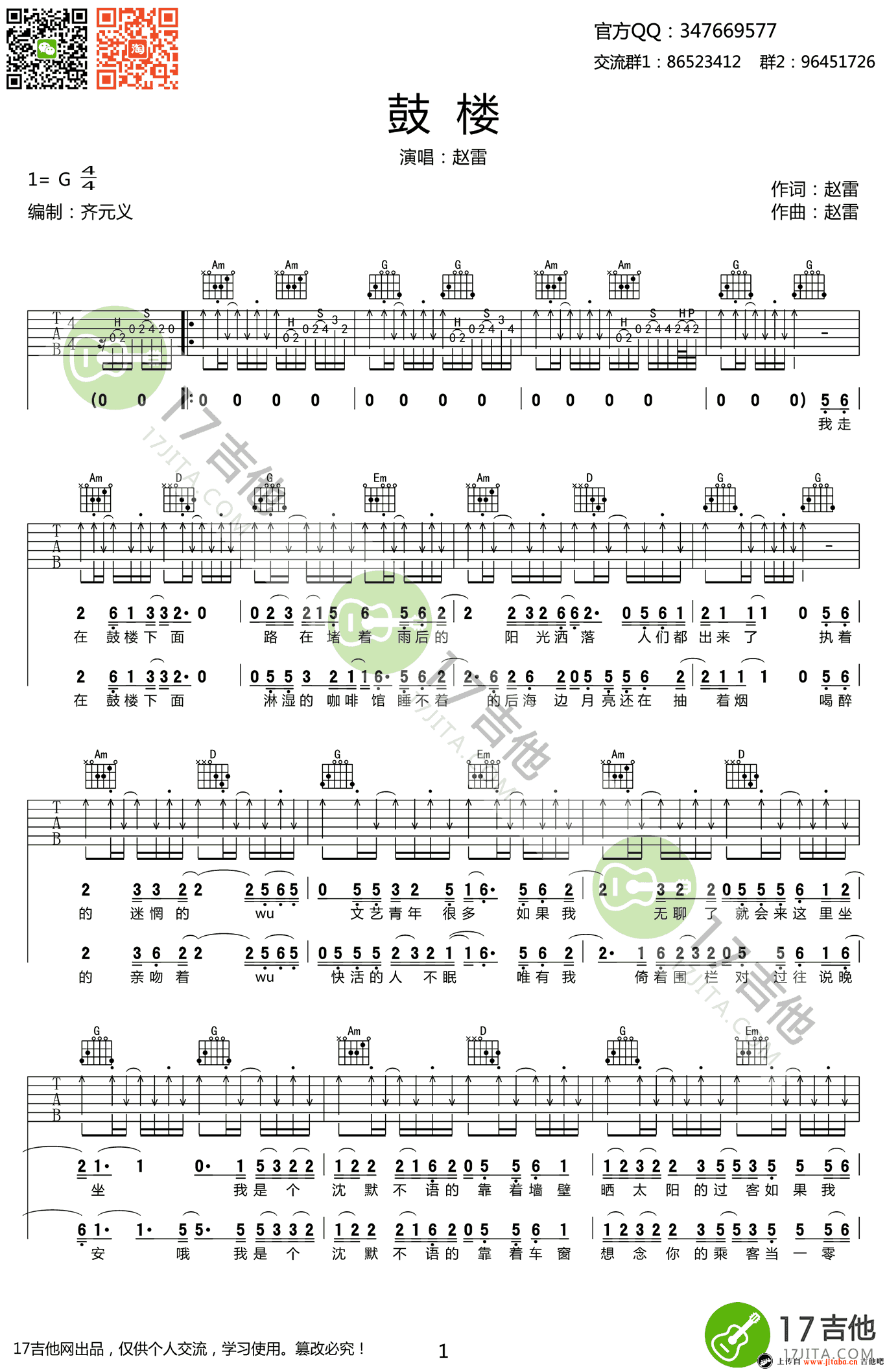 鼓楼吉他谱 - 赵雷 - G调吉他弹唱谱 - 原版