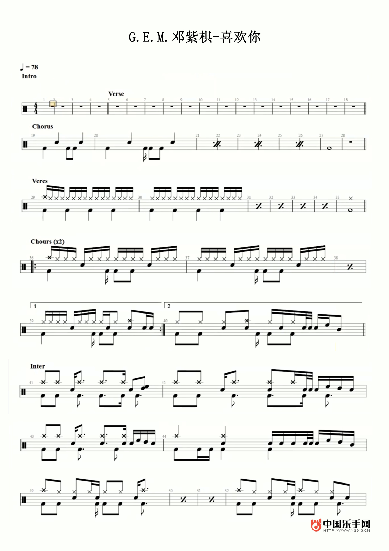 喜欢你鼓谱 - G.E.M.邓紫棋 - 架子鼓谱