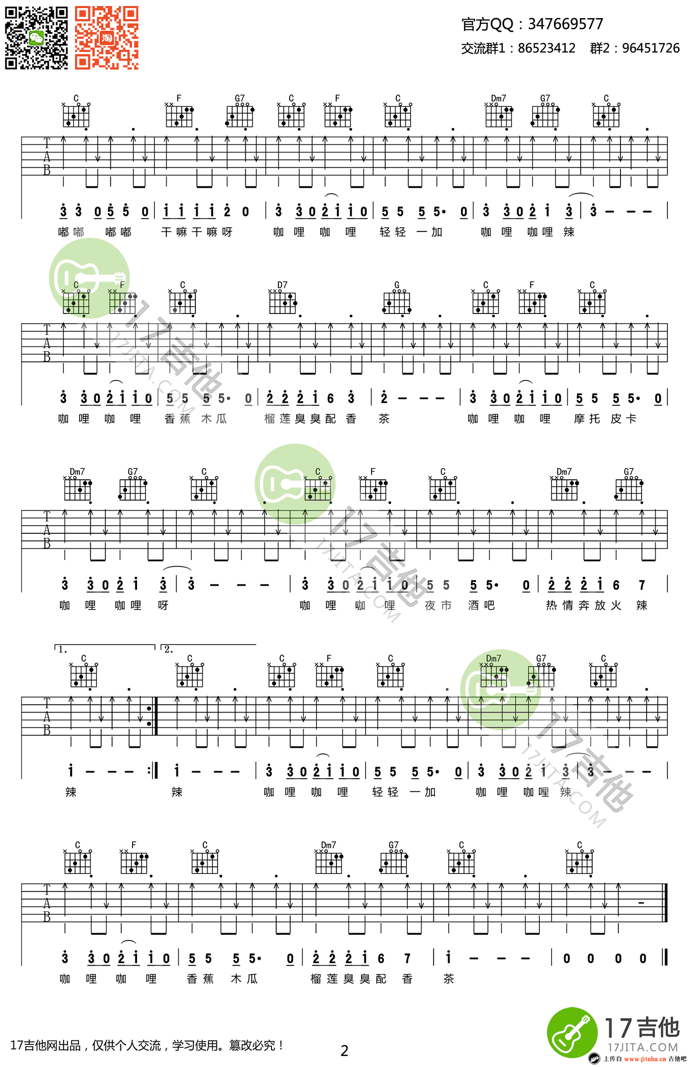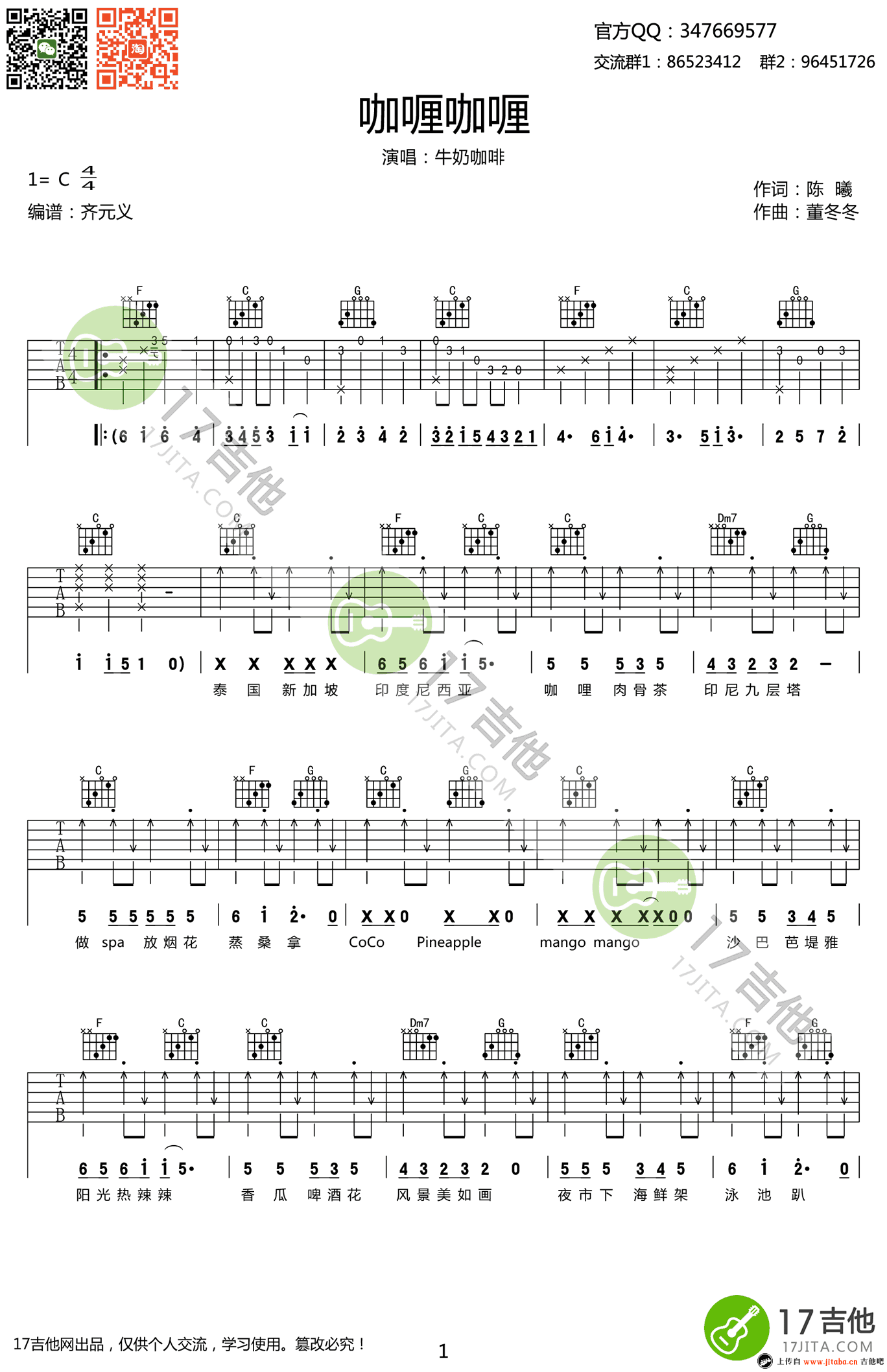 曲谱介绍: 牛奶咖啡《咖喱咖喱》吉他谱,C调指法编配,高清弹唱谱,咖喱咖喱六线谱,两张图片谱例。电视剧《欢乐颂2》插曲,曲风俏皮可爱,堪称新一代洗脑神曲;感谢齐元义老师制谱,91吉他谱为琴友们推荐收藏。 一首魔性的歌让人放飞心情,超级小清新,超级欢快的节奏感,给你夏天无比的清爽,带上生活的咖喱调味品,带上吉他,来一次说走就走的旅行吧~