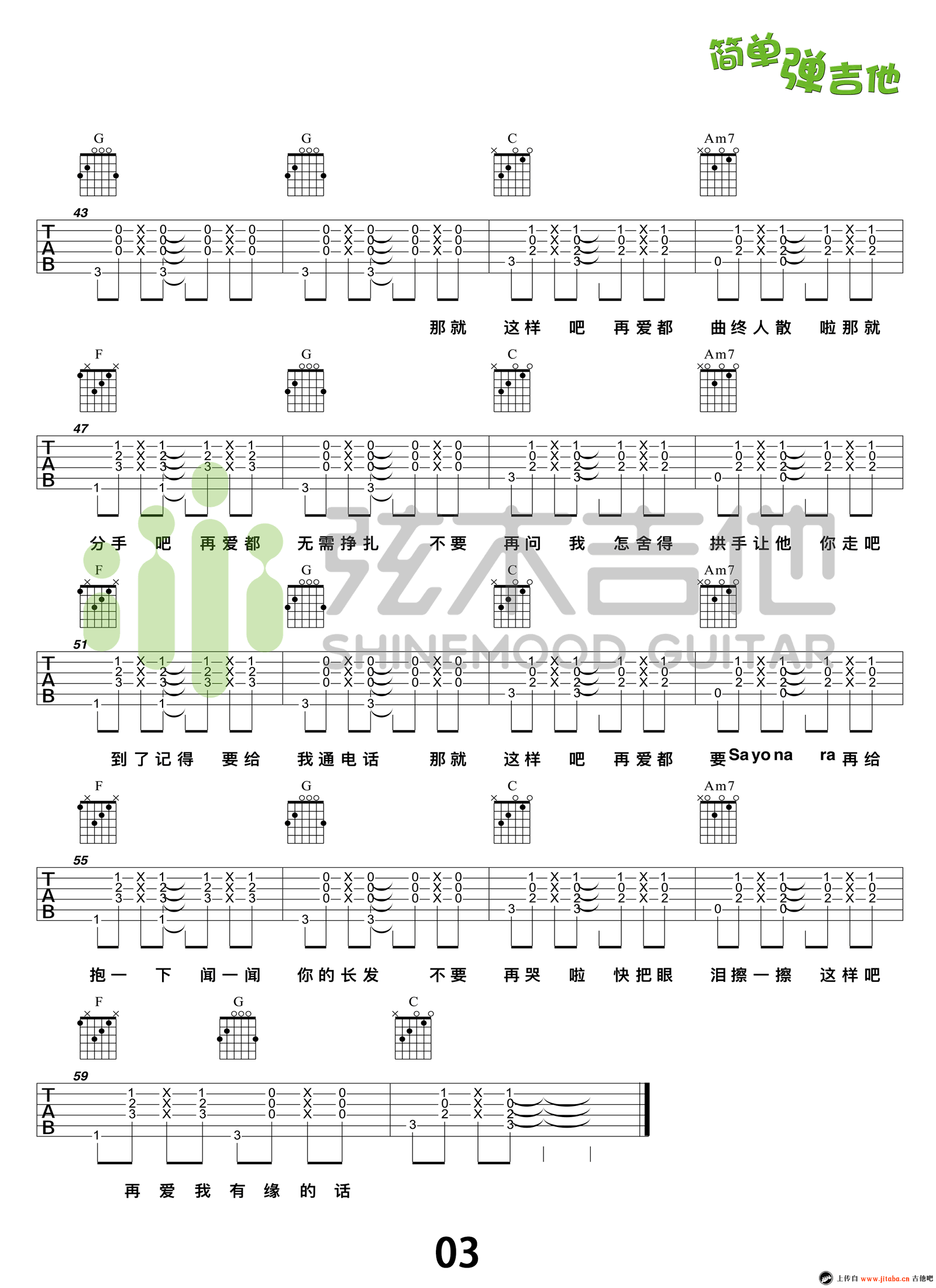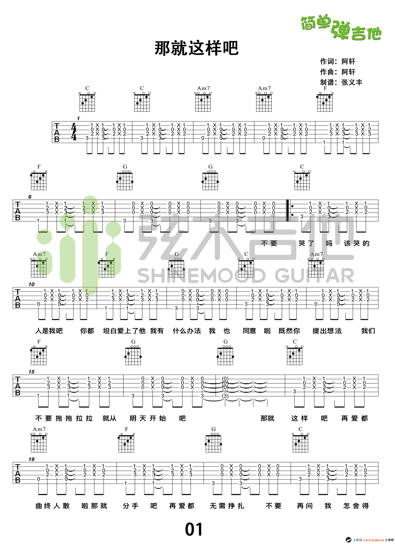 曲谱介绍: 动力火车《那就这样吧》吉他谱六线谱,C调指法编配,高清图片谱三张谱例。那就这样吧吉他弹唱谱,弦木吉他张义丰编配,91吉他谱上传推荐。