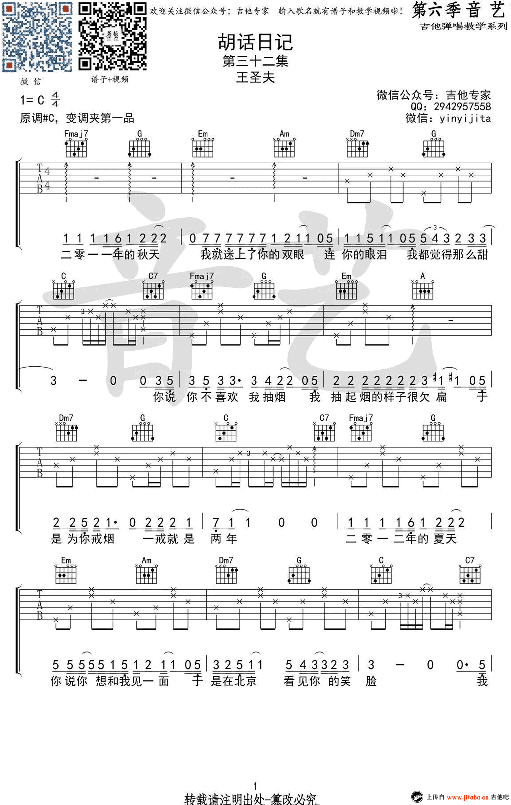 胡话日记吉他谱 - 王圣夫 - C调吉他弹唱谱