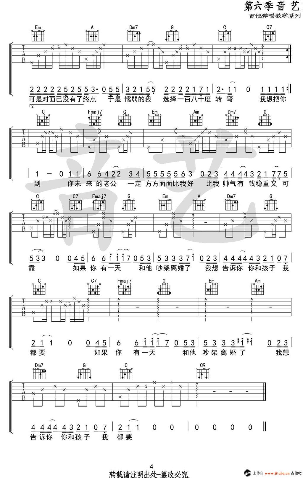曲谱介绍: 胡话日记吉他谱,王圣夫演唱,C调指法,变调夹夹一品。胡话日记吉他弹唱谱,四张图片谱,高清六线谱。音艺吉他编配,91吉他谱上传分享。 17年快乐男声长沙赛区的选手王圣夫的民谣原创歌曲,虽然比较小众,但依旧是很赞的一首歌曲。全曲的和声走向其实很简单 4 5 3 6 2 5 1 ,在某些地方特意用了一些色彩性的6级大和弦做变化!