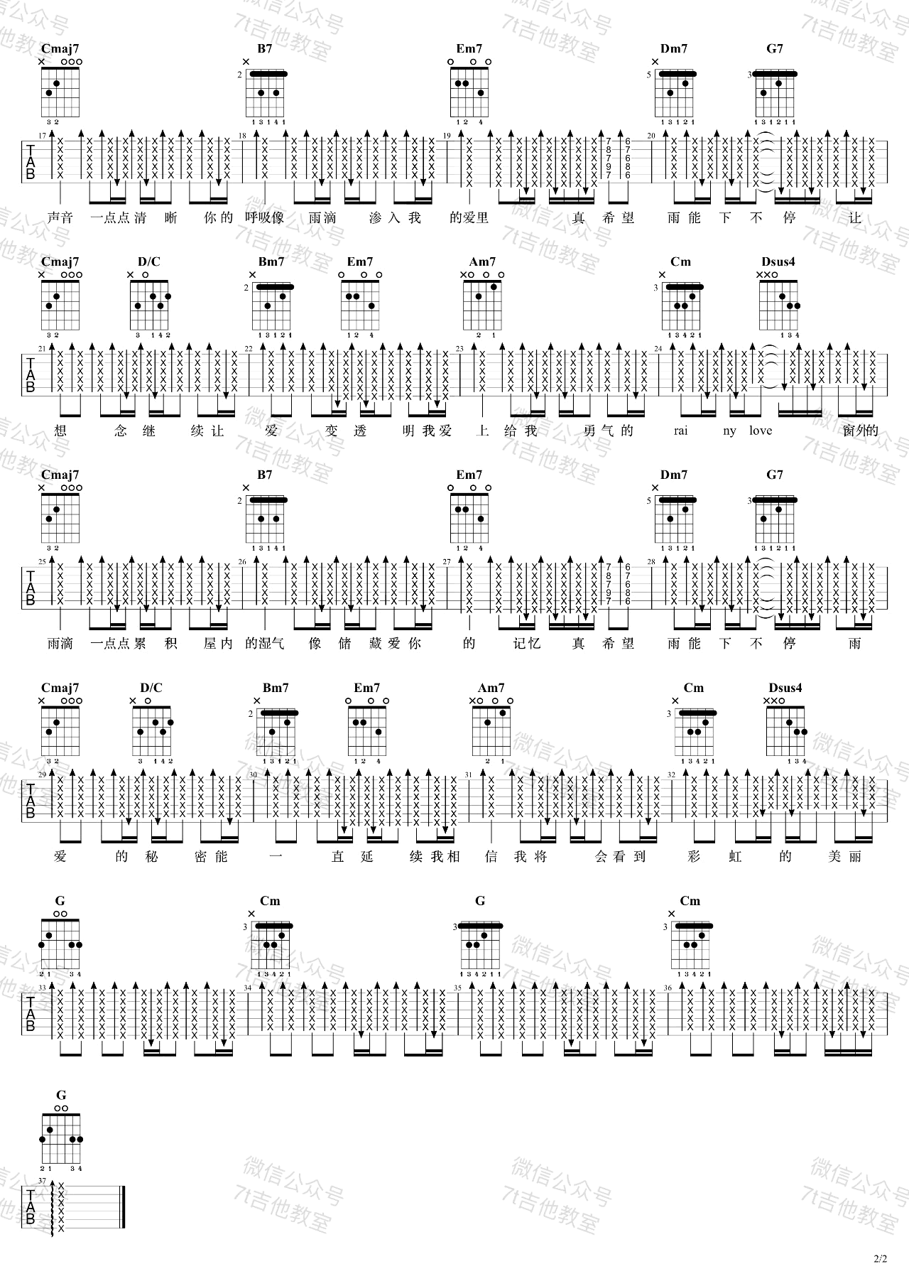 曲谱介绍: 吉他谱介绍:雨爱吉他谱,杨丞琳演唱的一首歌曲,4/4拍的节奏,这首歌曲的原调为E调,这里曲谱采用了G调指法进行编配,演唱时可根据个人情况选择变调夹,曲谱由琴谱网更新上传,共2张高清图片弹唱吉他谱例,来源于@7T吉他教室编配出品。这首歌曲有点轻摇滚的风格,电吉他的声音衬托了决裂的伤心。歌曲连表达伤心和离开都那么勇敢,希望每个受过爱情的伤的人,都能像这首歌一样“相信会看到彩虹的美丽”。 雨爱吉他弹唱教学