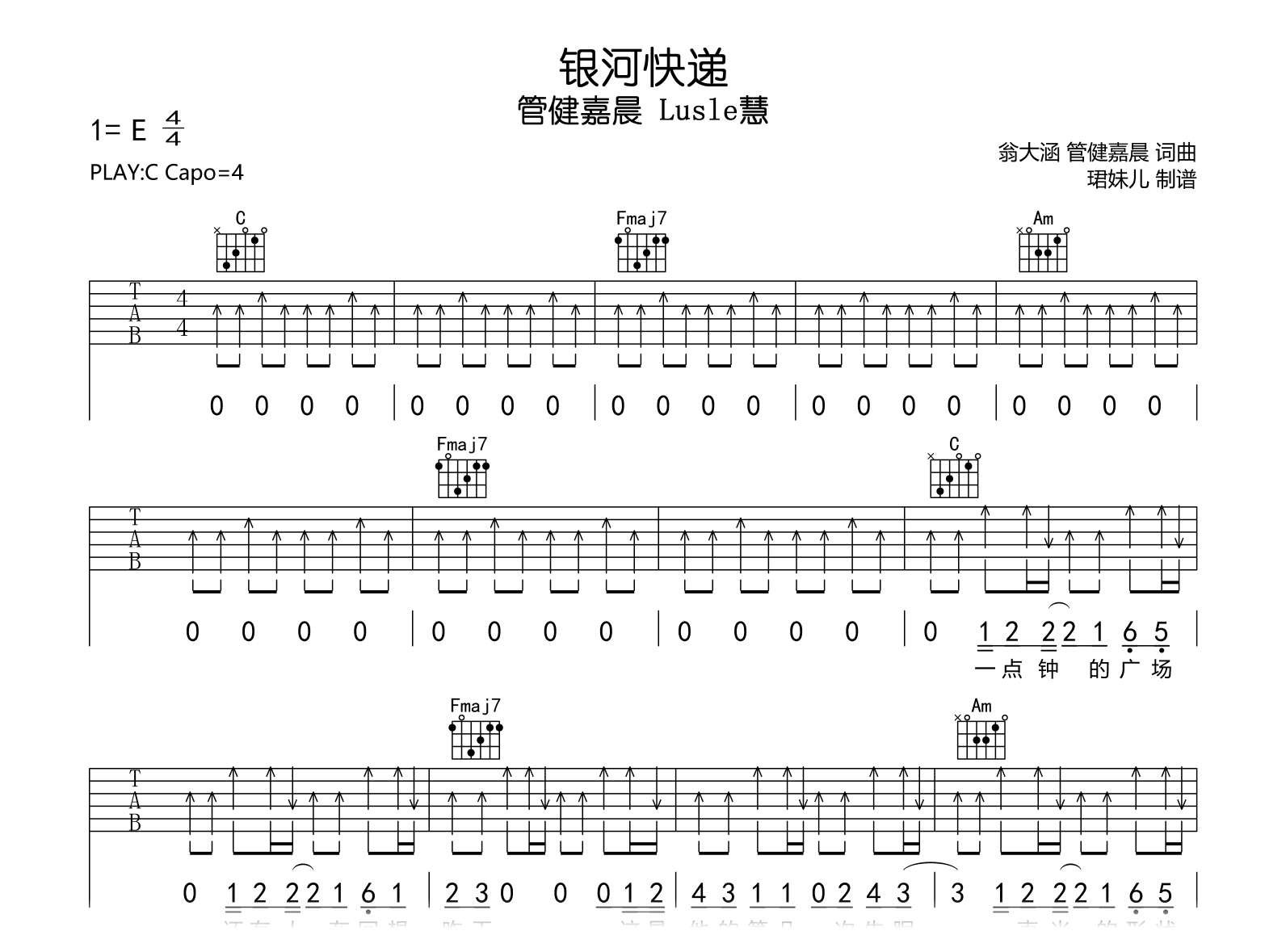 曲谱介绍: 银河快递吉他谱,管健嘉晨 Lusle慧演唱,《银河快递》吉他弹唱谱,原调E,采用C调指法编配,建议变调夹4品,速度85BPM,演奏易上手,难度较简单。