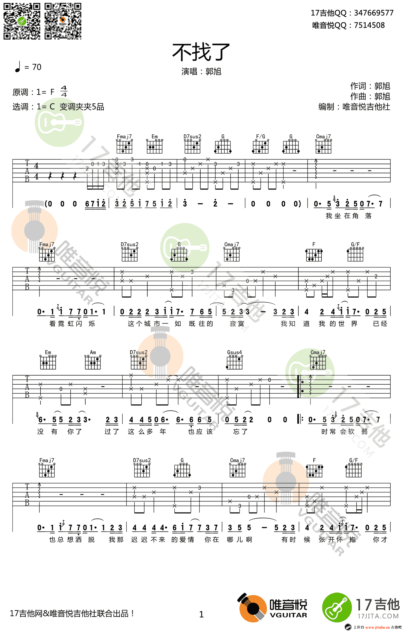不找了吉他谱 - 郭旭 - C调吉他弹唱谱