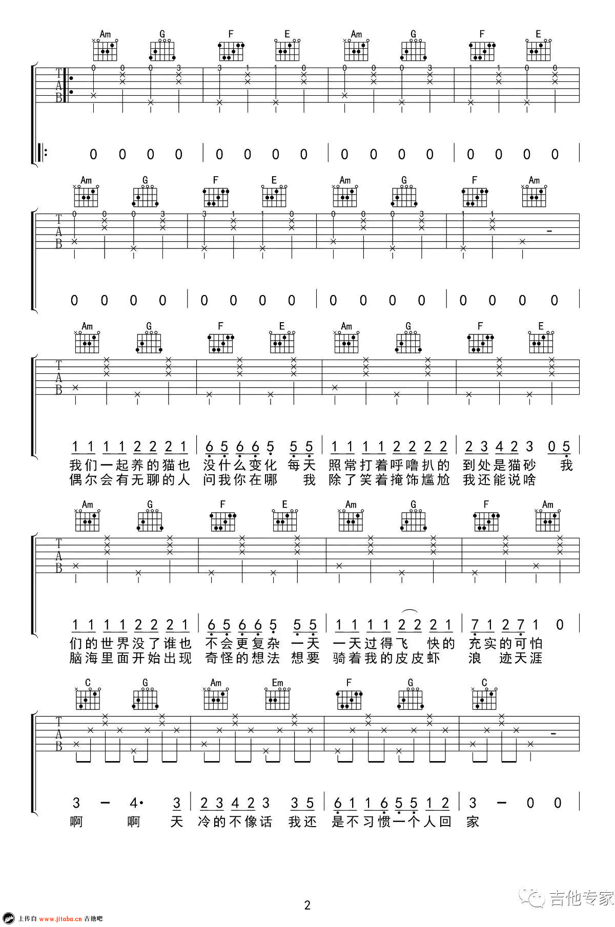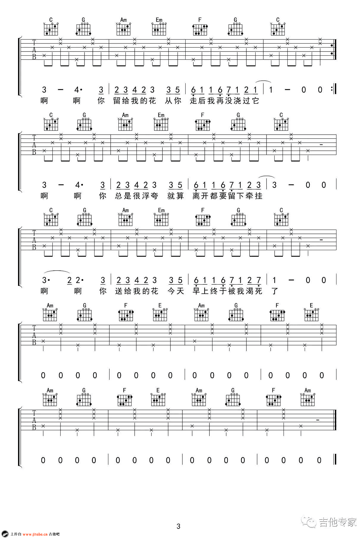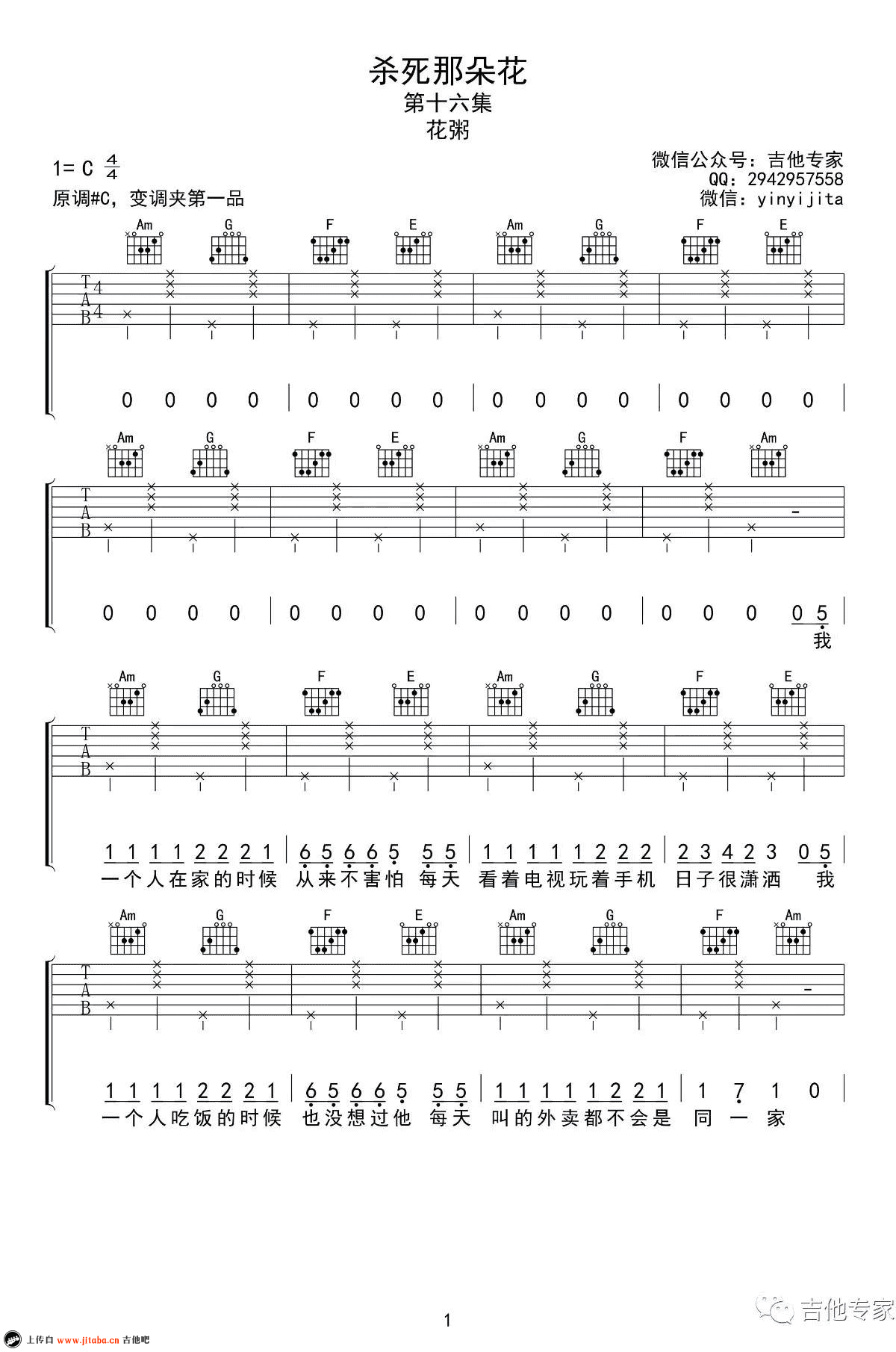 曲谱介绍: 杀死那朵花吉他谱,花粥的一首最新民谣歌曲,C调弹唱谱,变调夹夹一品,杀死那朵花六线谱,三张图片谱子,感谢吉他专家编配分享,91吉他谱www.jitaba.cn上传。 脑海里面开始出现奇怪的想法,想要骑着我的皮皮虾浪迹天涯。花粥的歌曲一如既往清新动听,吉他和弦走向简单,琴友们可以随性轻快的弹唱。