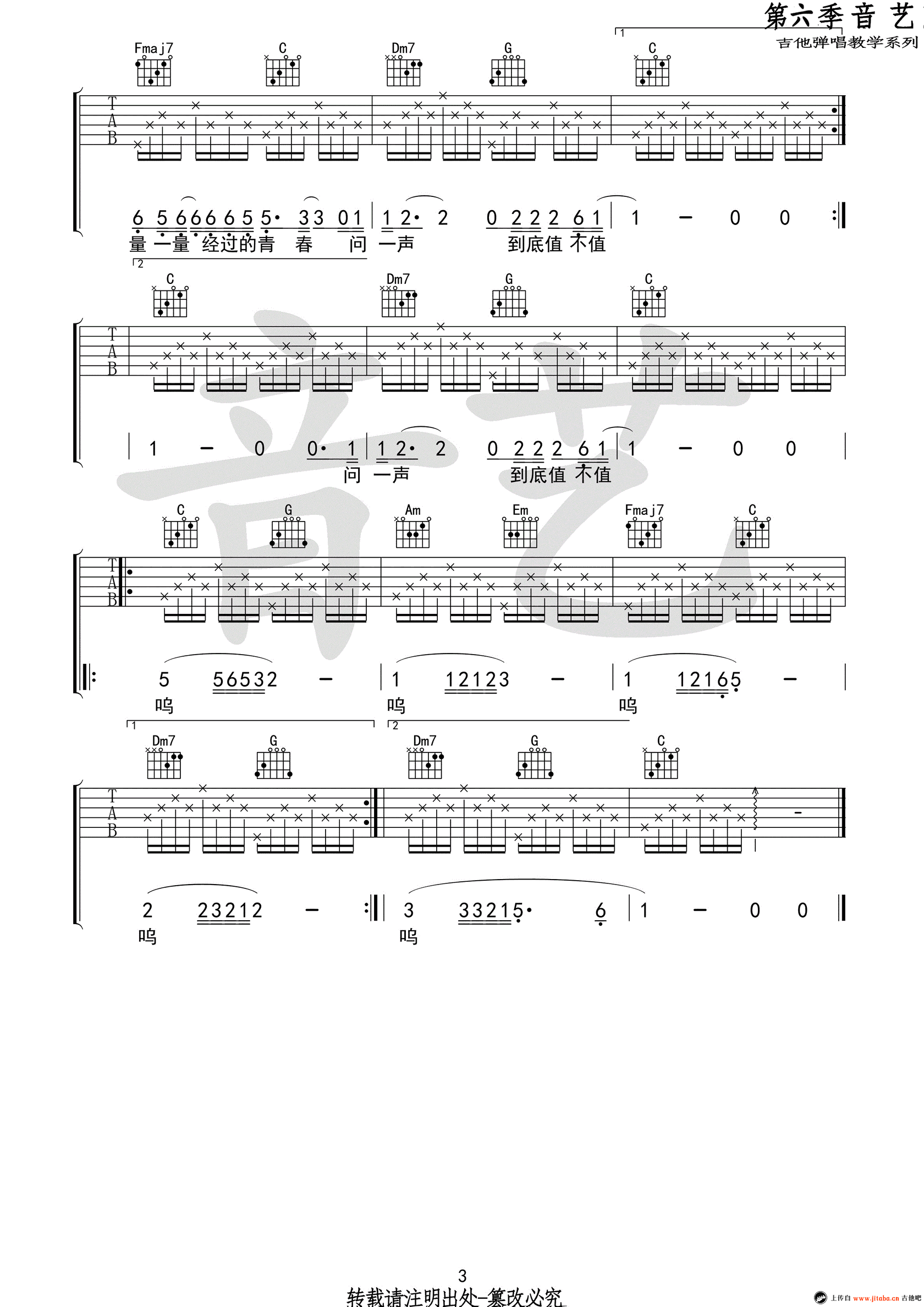 曲谱介绍: 人生吉他谱,夏小虎的一首民谣原创歌曲,人生吉他弹唱谱,C调版本,CAPO三品。曲谱为六线谱高清格式,分三张图片谱。音艺吉他编配分享,91吉他谱为琴友们上传推荐。
