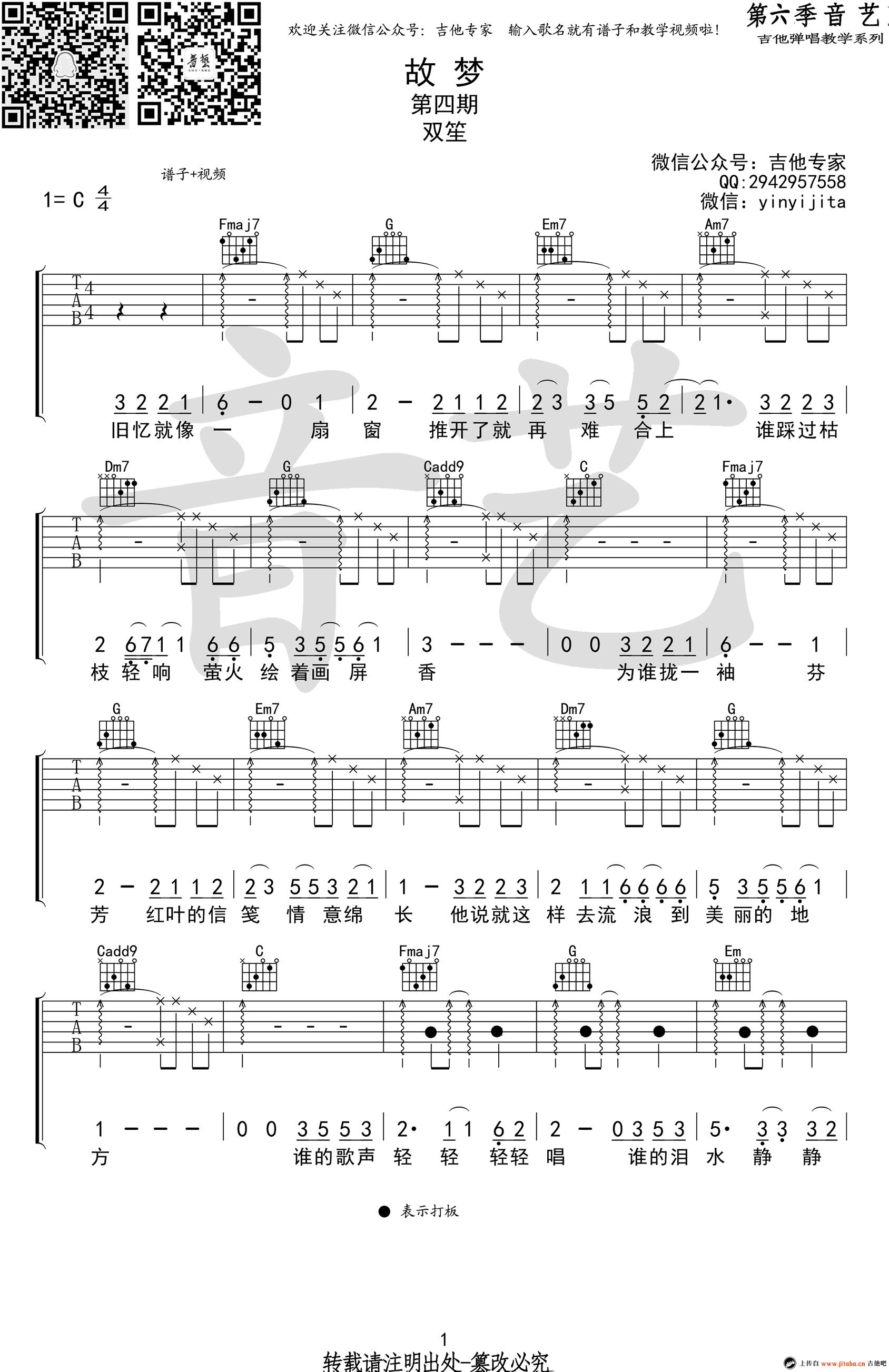 曲谱介绍: 故梦吉他谱,C调指法,高清图片谱。双笙女生翻唱版本,故梦吉他弹唱谱,六线谱完整版共四张谱例分两页为琴友们呈现。 旧忆就像一扇窗,推开了就难再合上。《故梦》是音乐团队墨明棋妙原创,橙翼主唱的一首惊艳时光的古风歌曲,旋律婉转悠扬,潺潺如水从心田流过,如风低吟呢喃如语的歌声轻诉人生惆怅。感谢艺音出品,91吉他谱网站整理上传分享。