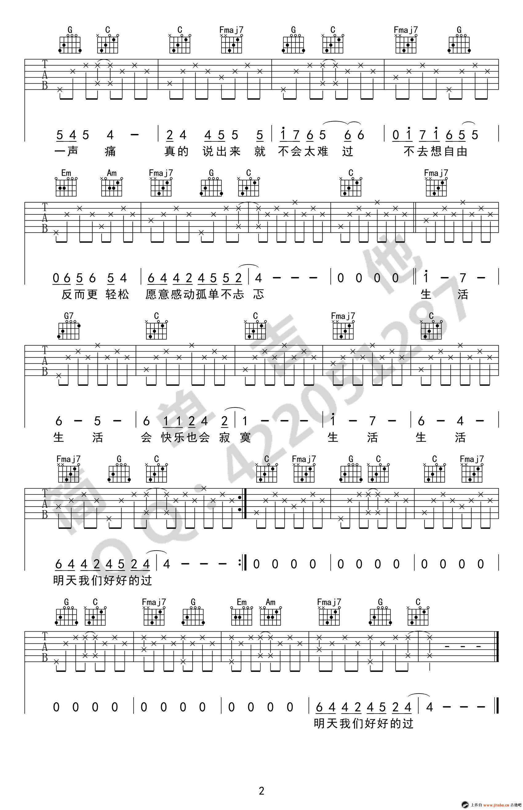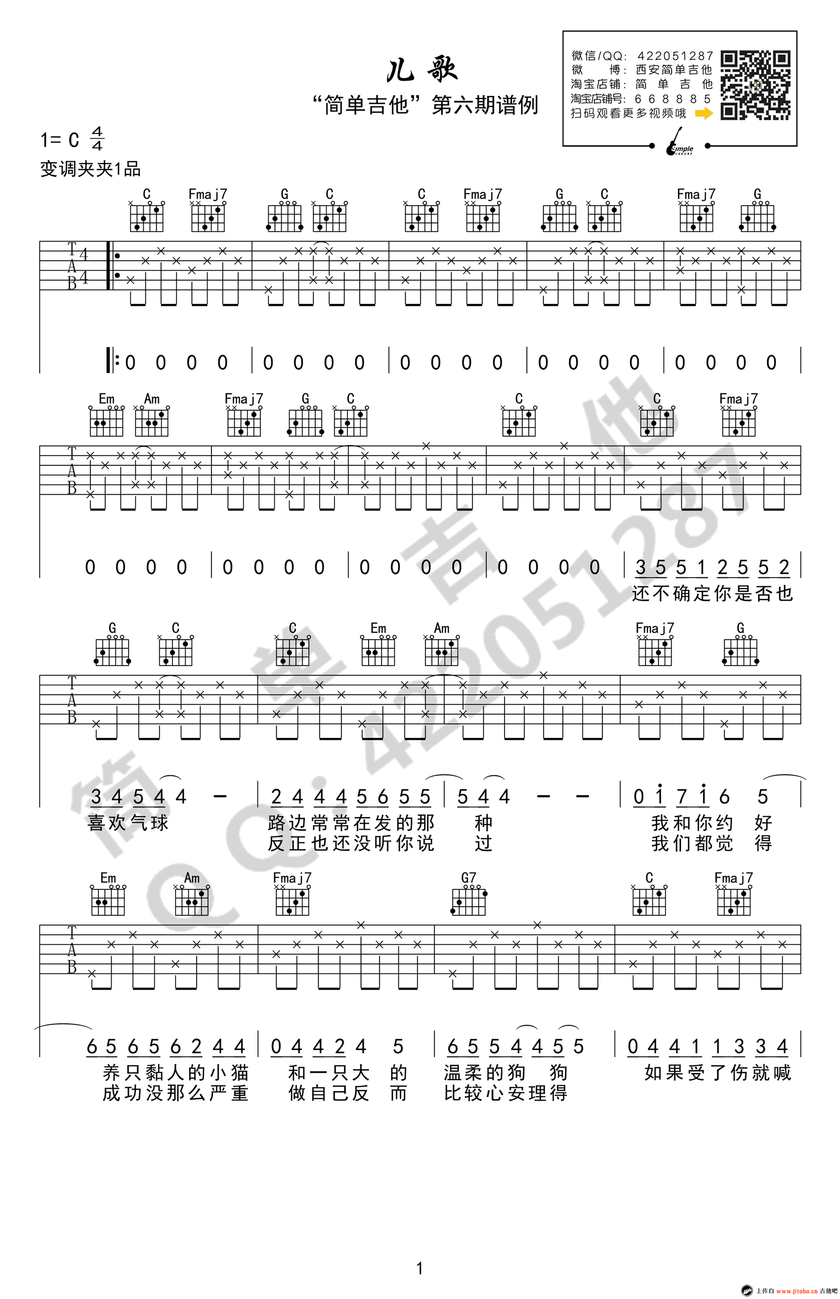 曲谱介绍: 张悬《儿歌》吉他谱,C调弹唱谱,变调夹夹一品。儿歌六线谱,图片谱高清版,简单吉他编配。