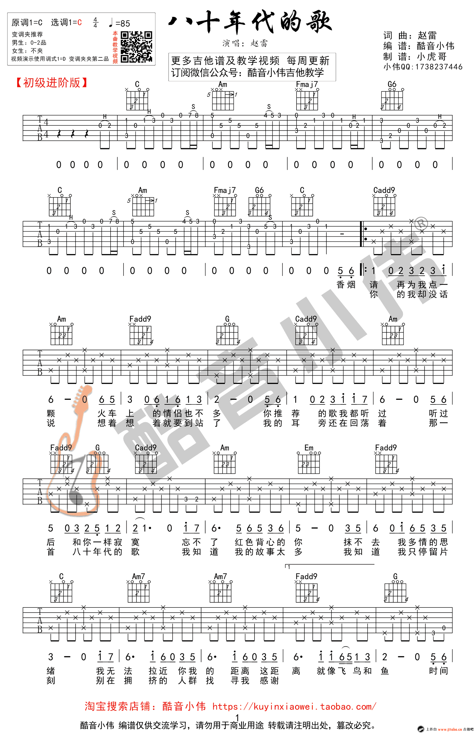 曲谱介绍: 八十年代的歌吉他谱,C调指法,初级进阶版,一首赵雷词曲原创民谣作品,八十年代的歌吉他六线谱,变调夹男生0-2品,女生不夹,视频演示使用D调式,变调夹夹第二品。感谢小伟老师编配并为琴友们带来《80年代的歌》吉他弹唱教学视频。