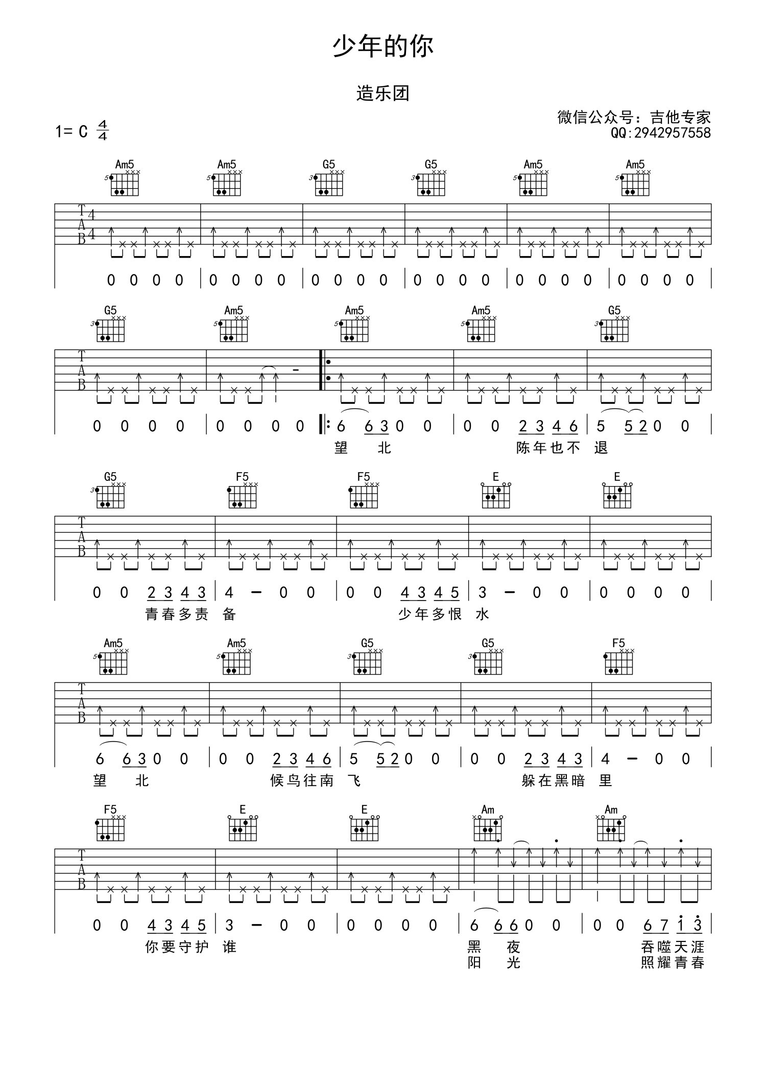 曲谱介绍: 造乐团《少年的你》吉他谱_C调吉他弹唱谱
