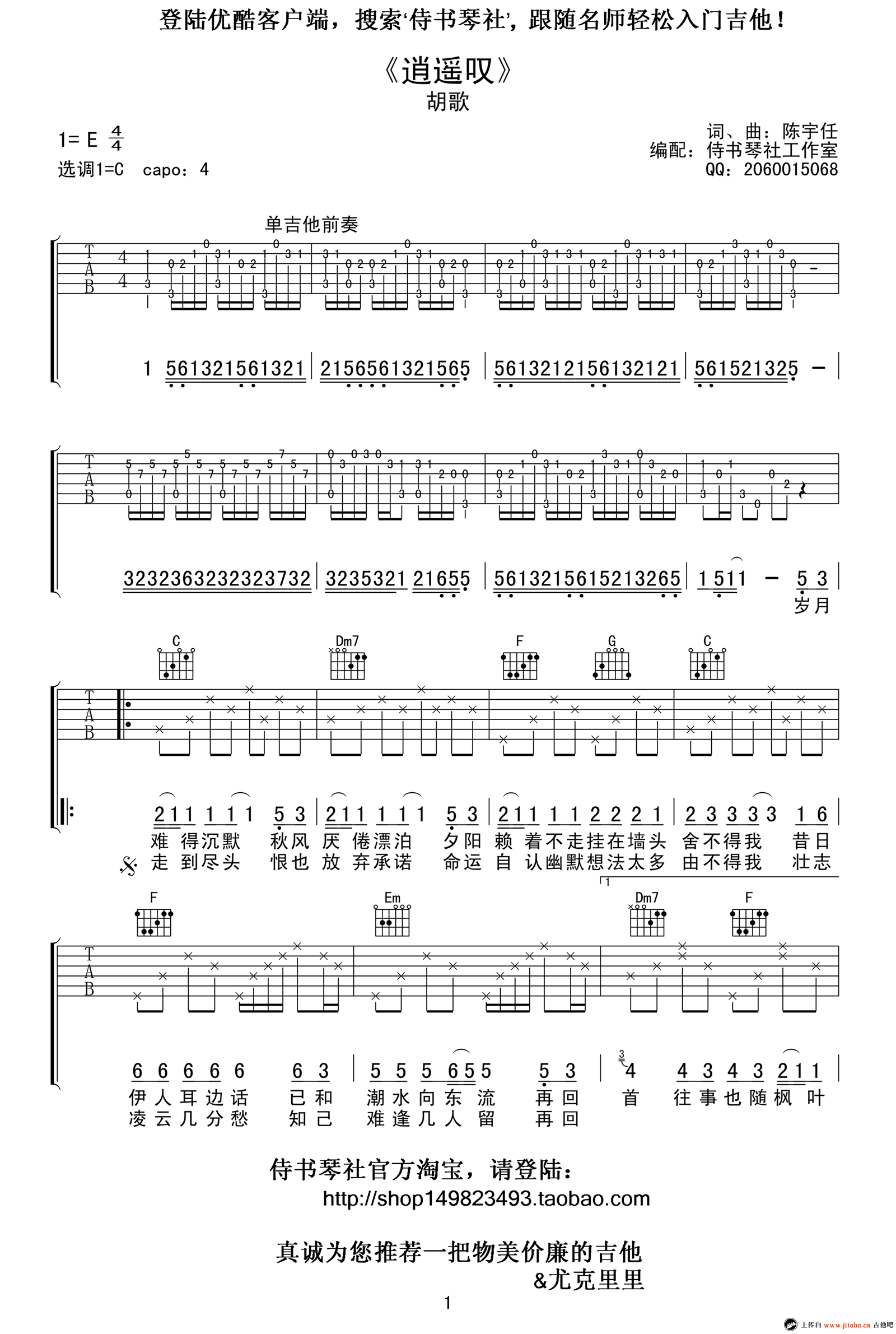 曲谱介绍: 逍遥叹吉他谱,胡歌演唱,玄幻神话电视剧《仙剑奇侠传》的插曲,逍遥叹吉他六线谱,原调E,选调C,CAPO夹四品,带单吉他前奏。逍遥叹吉他弹唱谱,高清版图片谱共三张谱例。感谢侍书琴社工作出品,91吉他谱网站推荐分享。 好听的中国风歌曲,2005年,一首歌,一部剧,经典的画面,熟悉的旋律,喜欢潇洒帅气的逍遥哥哥,喜欢豪爽大方的林月如,喜欢天仙妹妹似的赵灵儿,喜欢当年看这部剧时内心里满是感动的心情 。