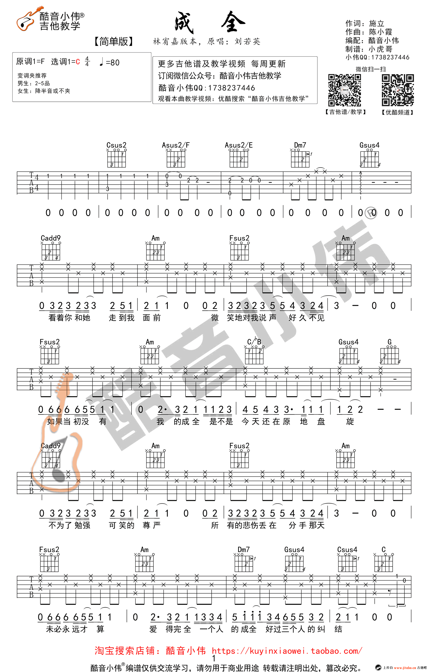 曲谱介绍: 林宥嘉《成全》吉他谱,C调简单版,成全吉他弹唱谱,六线谱高清图片,三张谱例。歌曲演唱刘若英,本曲谱为林宥嘉版本,变调夹男生2-5品,女生降半音或不夹。感谢酷音小伟编配。 Yoga天生讲故事的好嗓,时而浑厚时而轻佻,真假音的切换自如,迷到很多人的一首翻唱。《成全》吉他弹唱谱中级版和弹唱教学移步:吉他讲解视频