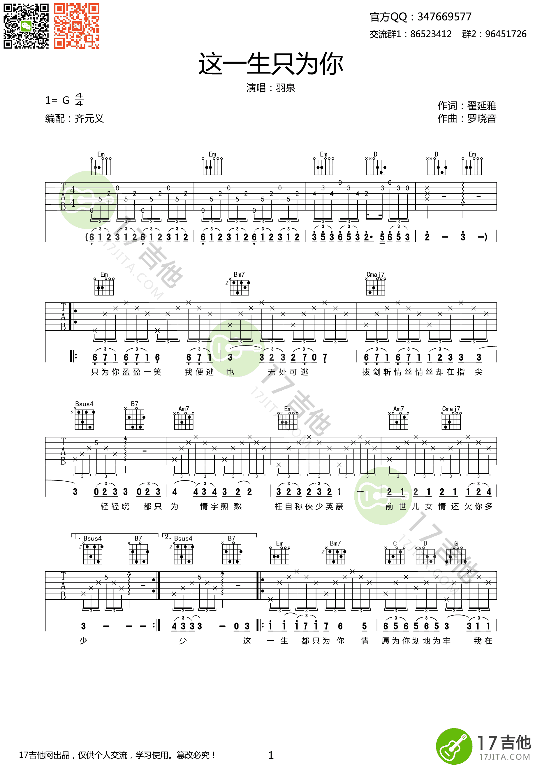 曲谱介绍: 这一生只为你吉他谱,羽泉演唱,这一生只为你六线谱,高清弹唱谱,G调指法,共三张图片谱例。歌曲是《剑侠情缘》主题曲。 歌曲情意缠绵,唱出凄美与无悔执著,羽泉组合胡海泉陈羽凡的一首《这一生只为你》 诉说着画地为牢的感伤,百转柔肠的旋律是否也触动了你的内心?感谢齐元义编配,《这一生只为你》吉他谱,由91吉他谱网站上传分享。