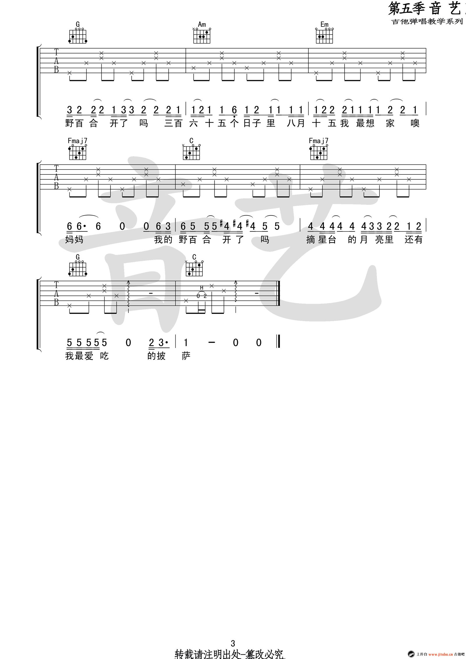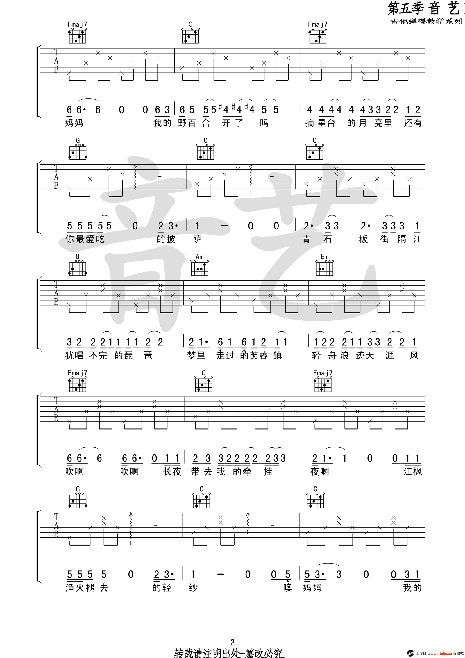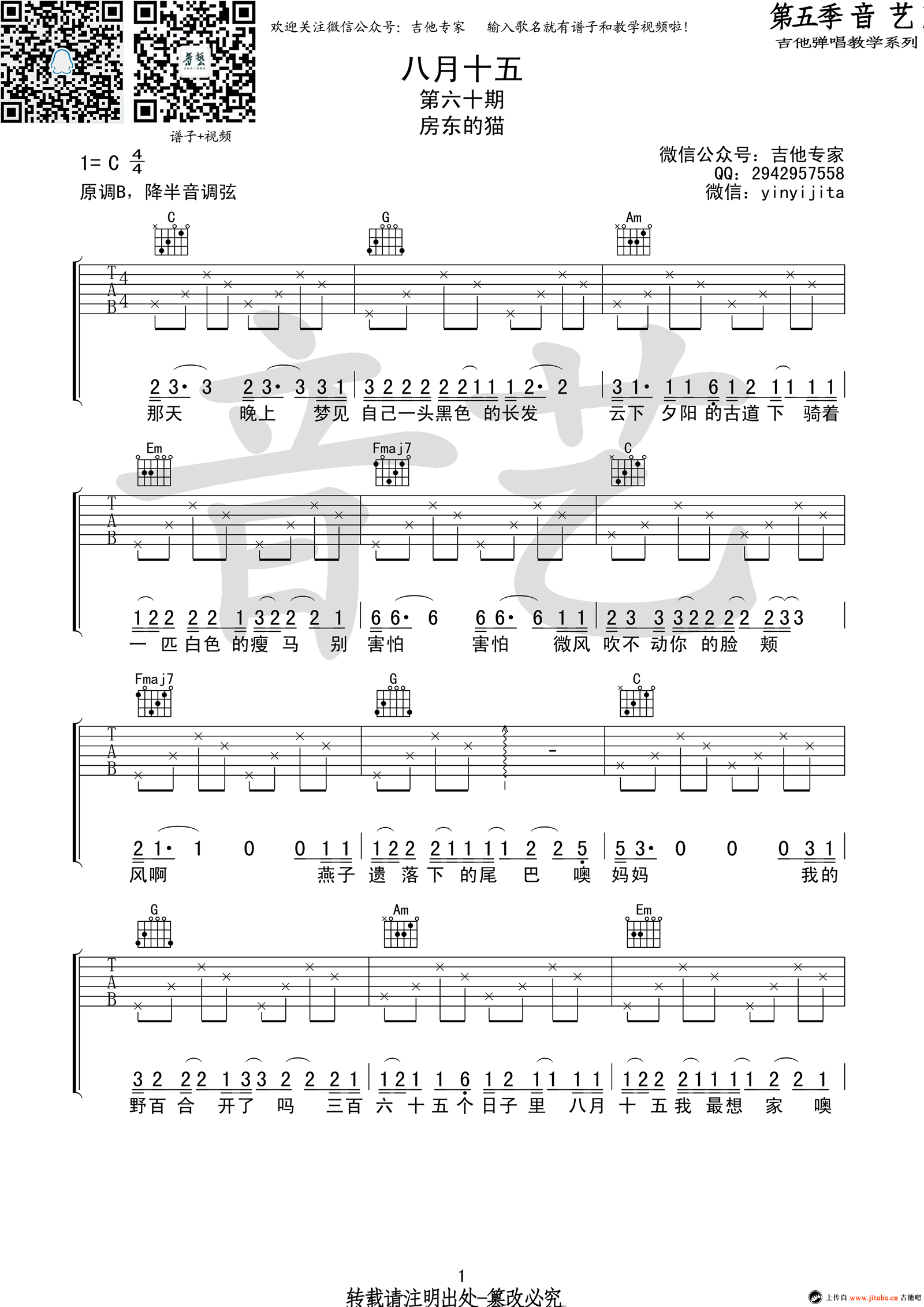 八月十五吉他谱 - 房东的猫 - C调吉他弹唱谱