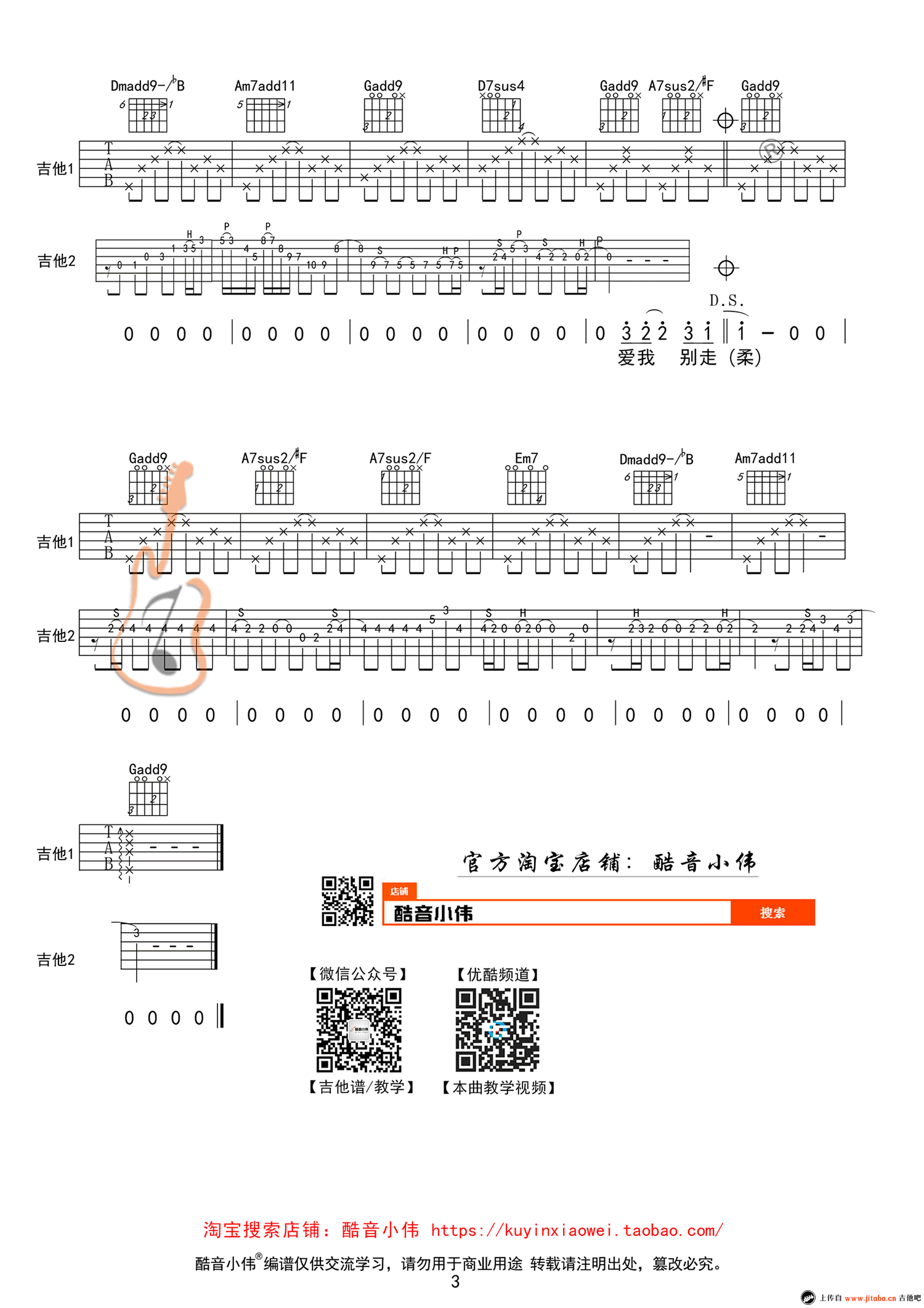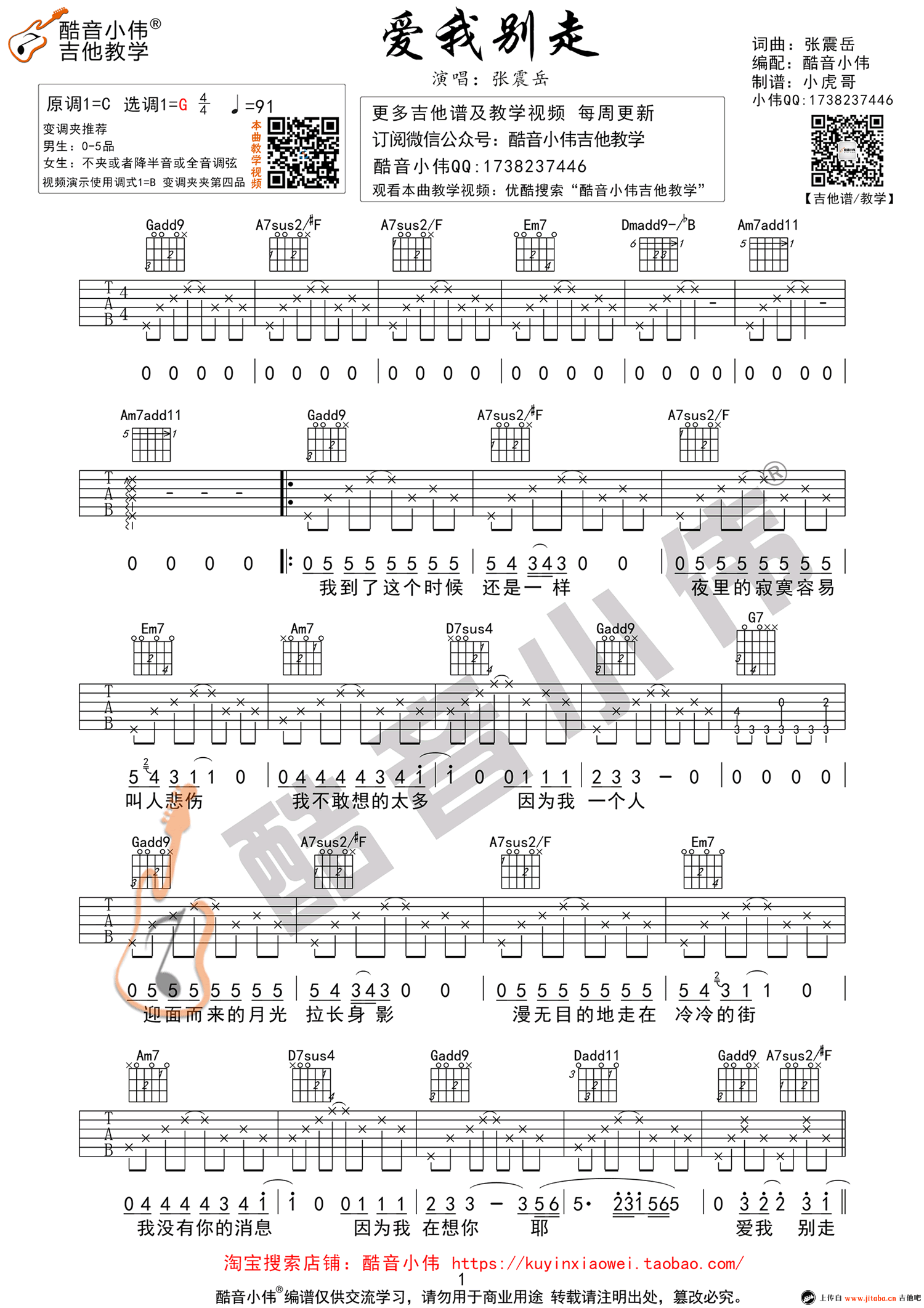 曲谱介绍: 张震岳《爱我别走》吉他谱,原调C选调G,男生变调夹推荐0-5品,爱我别走弹唱教学视频演示使用的调式为B,变调夹夹第四品,女生不夹或者降半音或全音调弦。没有人会无缘无故的说放下就放下,说离开就离开。张震岳看似不羁情歌却格外细腻动人,爱我别走六线谱,三张图片谱例高清版。感谢酷音小伟编配并提供吉他教学。91吉他谱网站整理上传。