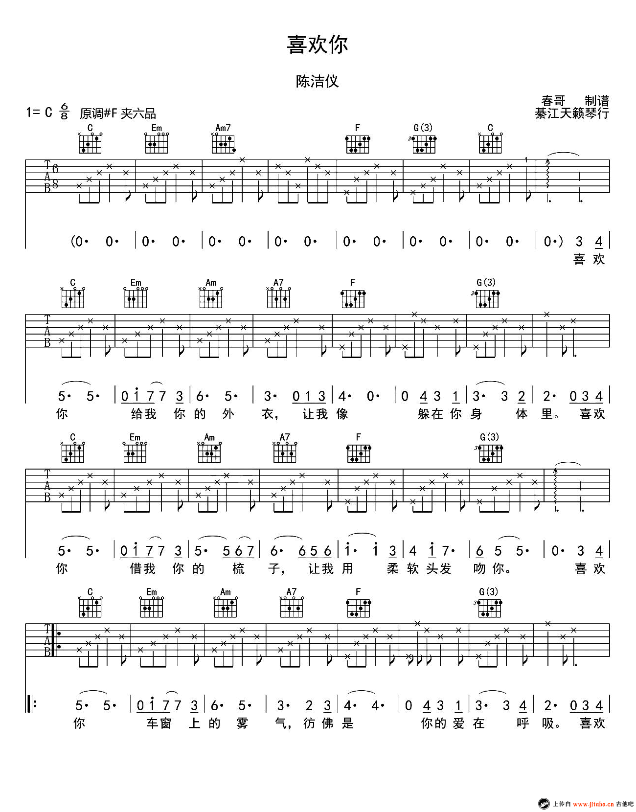 曲谱介绍: 喜欢你吉他谱,新加坡女歌手陈洁仪演唱版本,歌曲原调#F,选用C调,CAPO六品。喜欢你六线谱,图片谱格式高清版本,感谢春哥制谱。 这首《喜欢你》是一首痴情女子的爱情金曲,陈洁仪唱出了成熟女人的美好,我是歌手节目里面,徐佳莹则唱出小女生对爱情的憧憬,歌声里有着宛若初见的纯净,含蓄而又果敢。