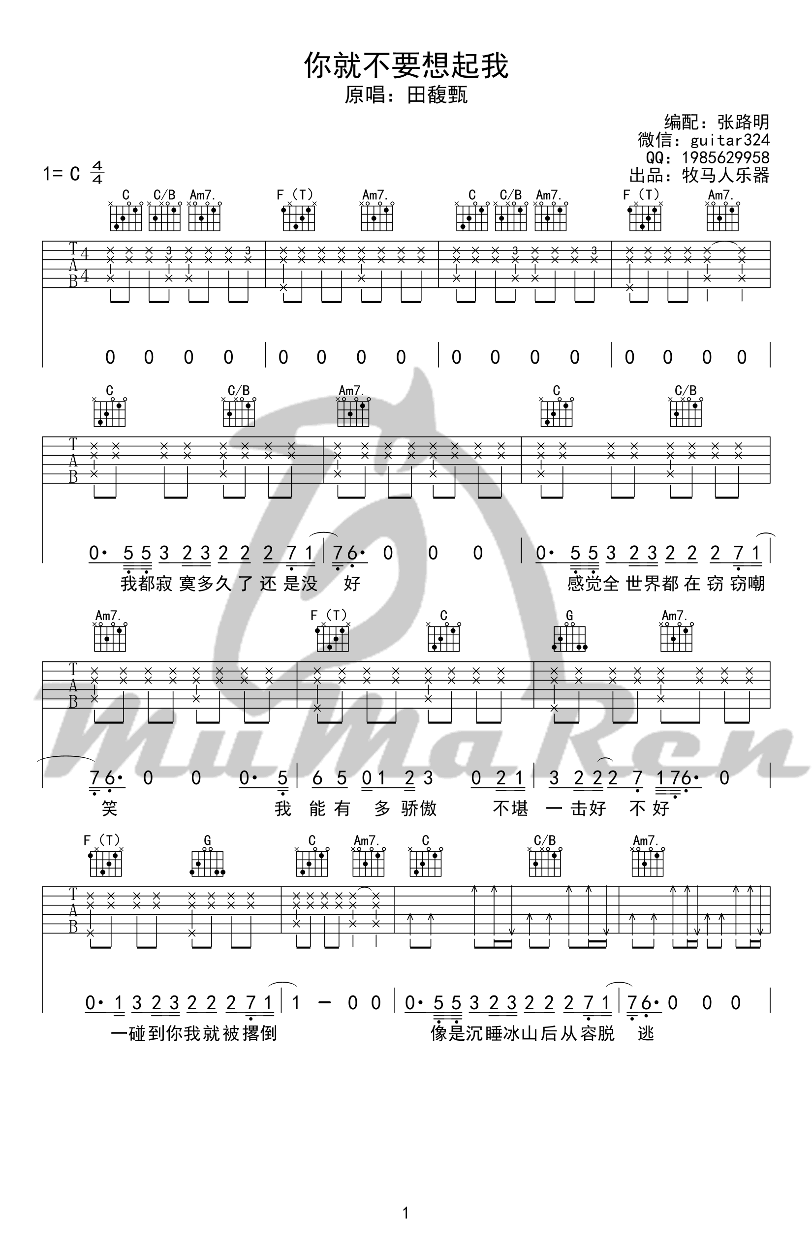 曲谱介绍: 田馥甄《你就不要想起我》吉他谱,C调指法编配,六线谱编配高清版。你就不要想起我吉他弹唱谱,4张图片谱例两页显示。感谢张路明编配。