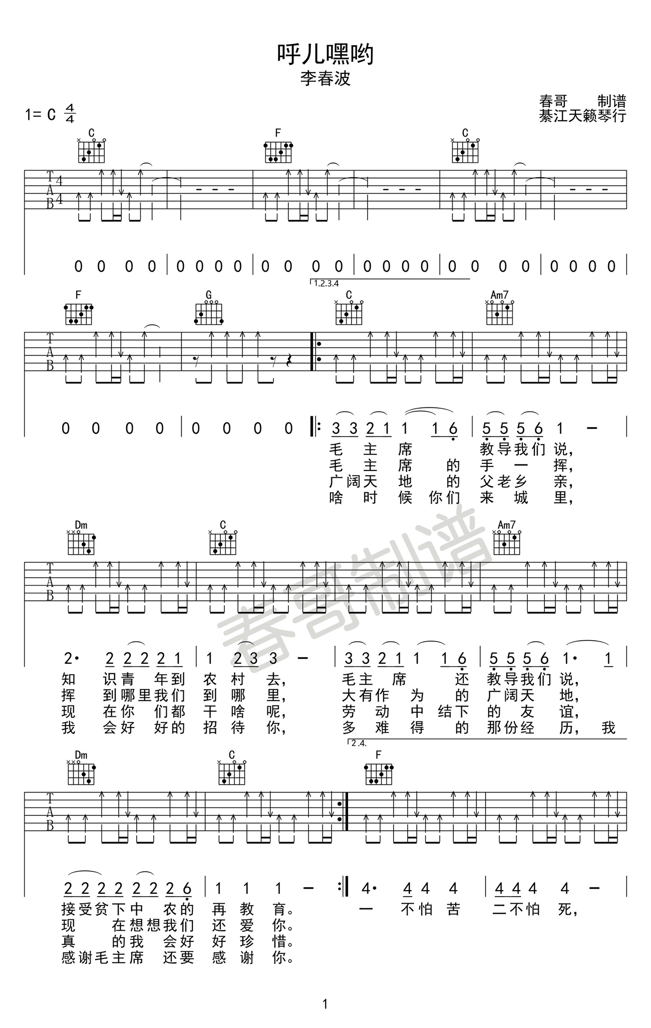 呼儿嘿呦吉他谱 - 李春波 - C调吉他弹唱谱