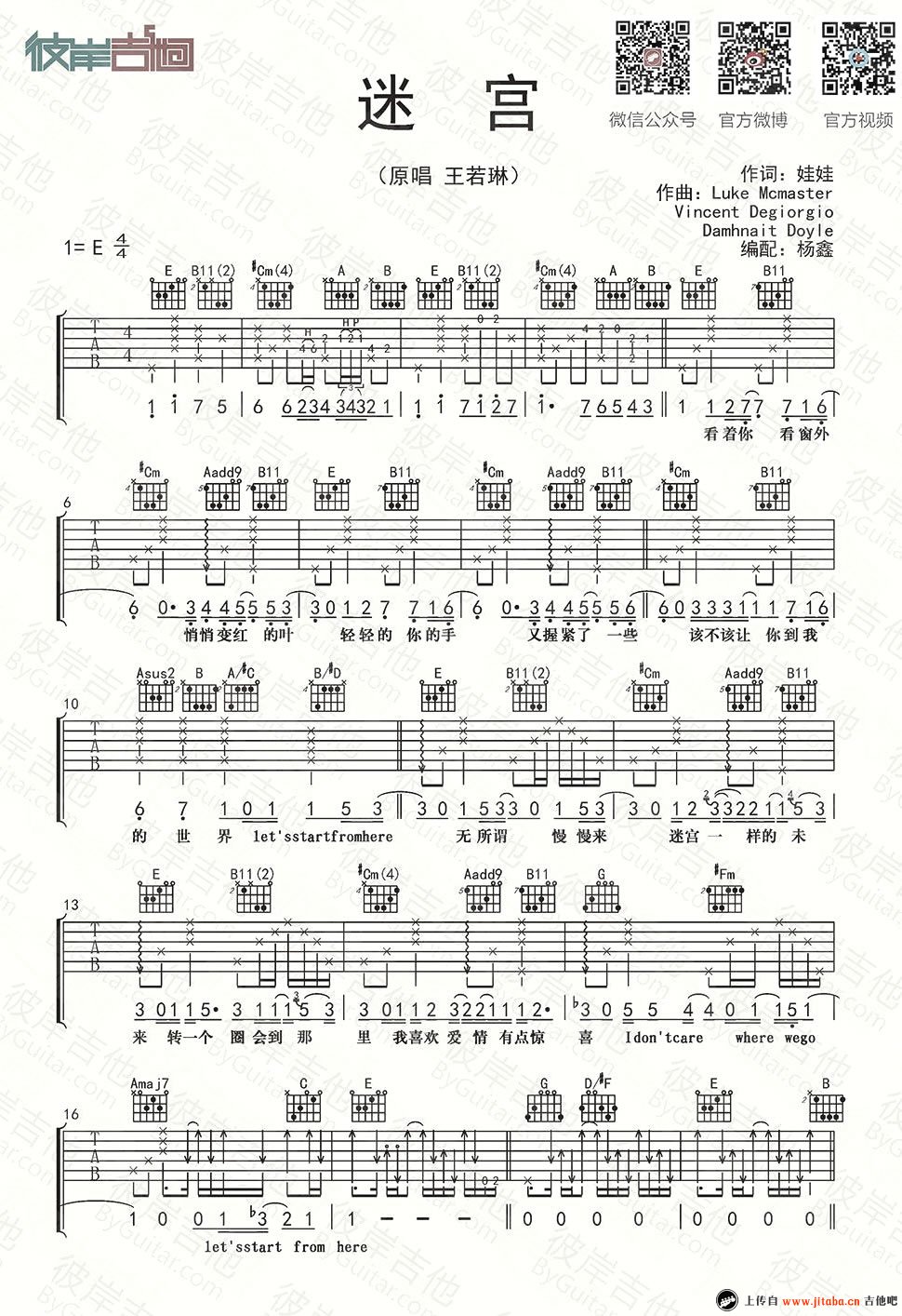 曲谱介绍: 迷宫吉他谱,王若琳演唱,E调编配,迷宫吉他弹唱谱,三张图片谱高清版,迷宫六线谱,随谱附上杨鑫老师和美女骆爽灵带给大家的弹唱视频,感谢彼岸吉他出品,91吉他谱网站为琴友们上传。 慵懒而感性的声音,温暖的像若有若无的阳光,听到王若琳的这首《迷宫》,让人赖在沙发上不想起来。让我们的心静下来,慢慢感受,那迷一样的美好。