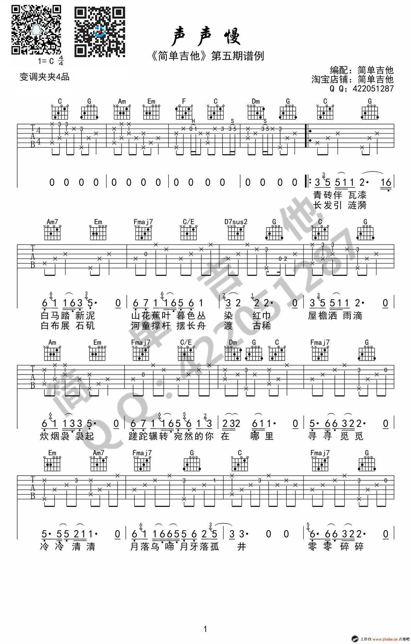 曲谱介绍: 崔开潮《声声慢》吉他谱,C调指法,变调夹夹四品。声声慢吉他弹唱谱,六线图片谱高清版,感谢简单吉他编配制谱,91吉他谱网站为琴友们整理上传。 歌声悠远温暖,讲述了一个半醉半醒的故事。整首歌营造出的是一种美好平淡的生活状态,听他唱歌,就像坐上一列行驶缓慢的火车,开往那些令人怀念的时光,沉醉在山水田园里。