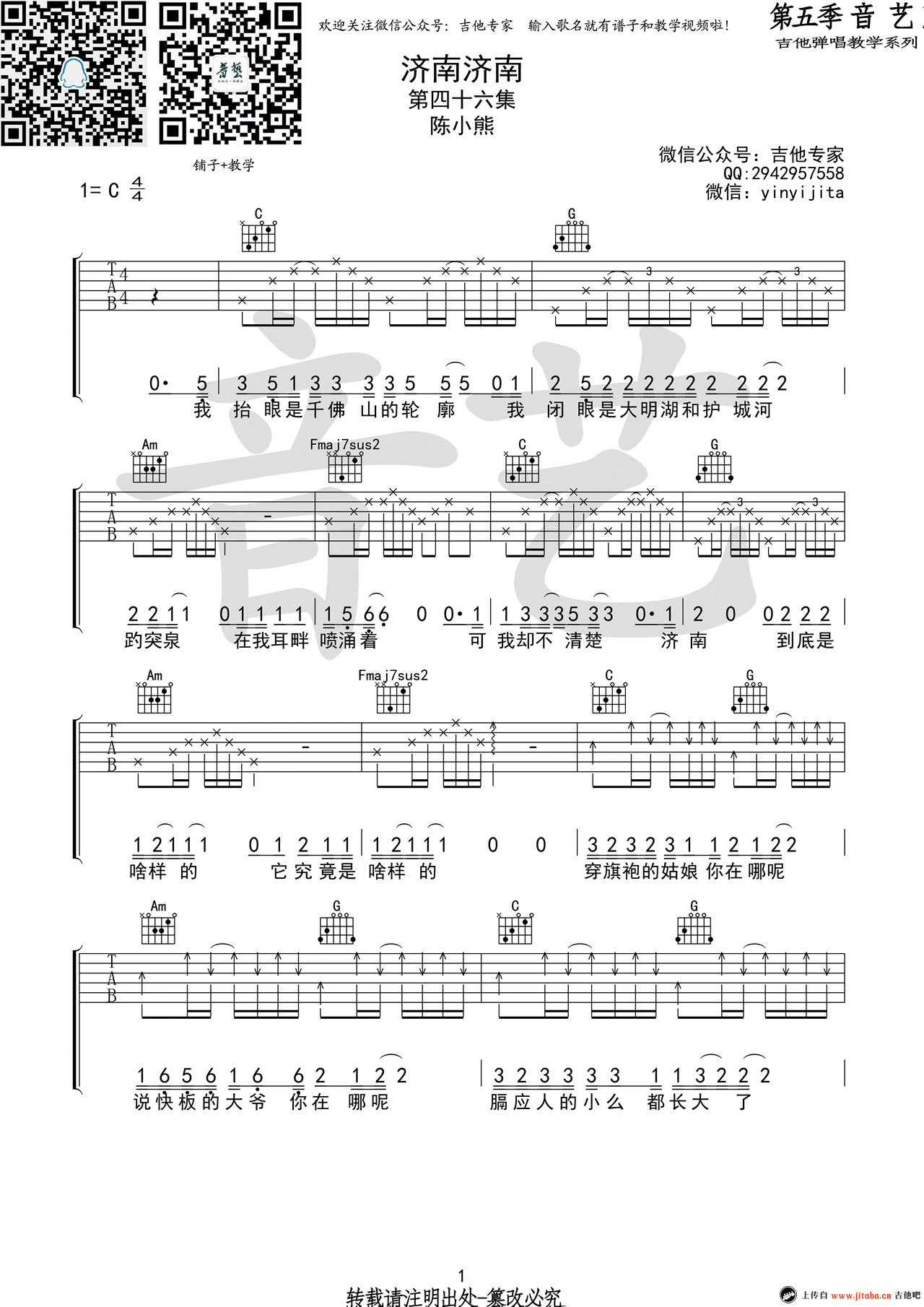 济南济南吉他谱 - 陈小熊 - C调吉他弹唱谱
