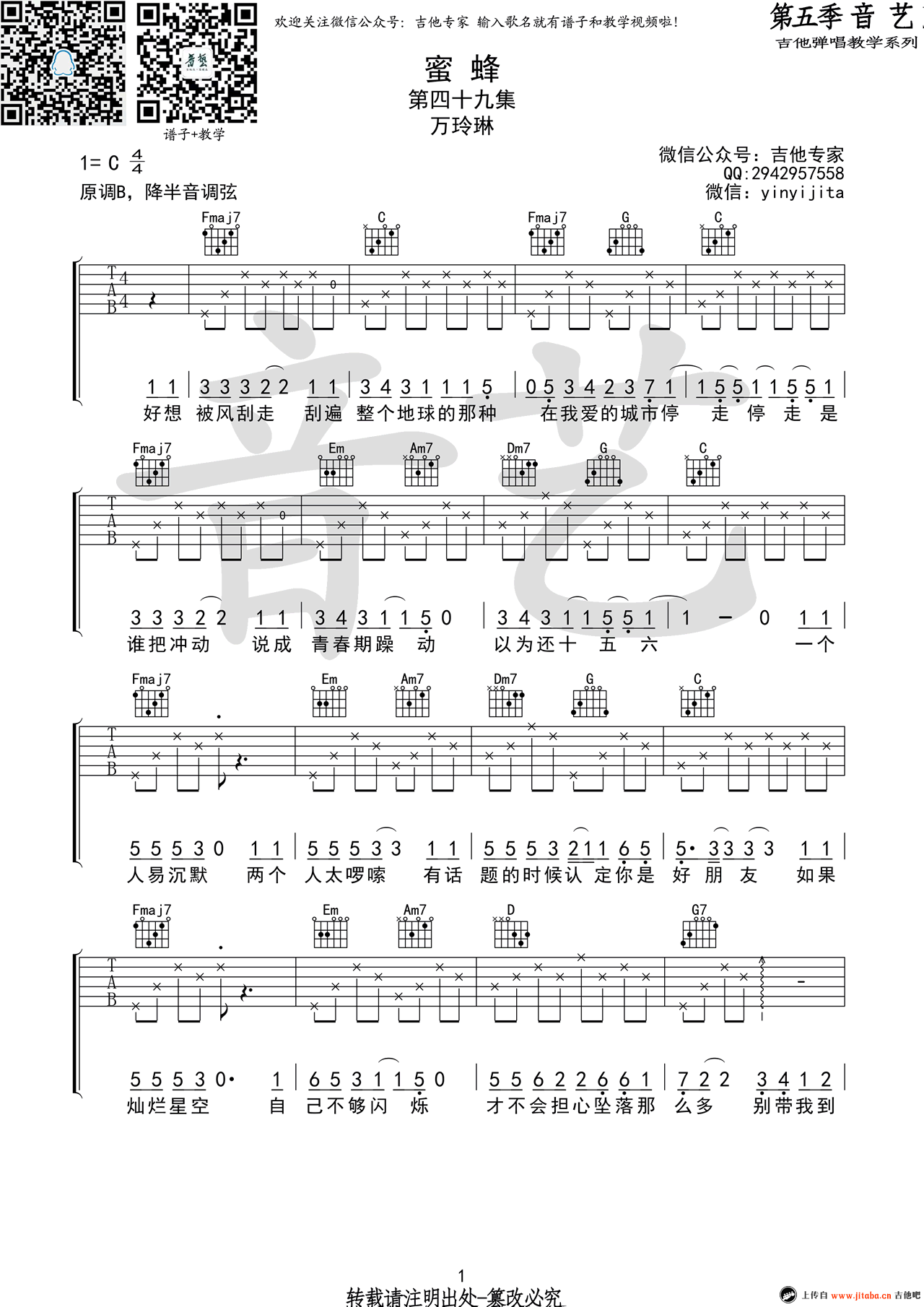 曲谱介绍: 蜜蜂吉他谱,万玲琳演唱,蜜蜂吉他弹唱谱,原调B,降半音调弦,选用C调指法编配,完整版共四张图片谱。