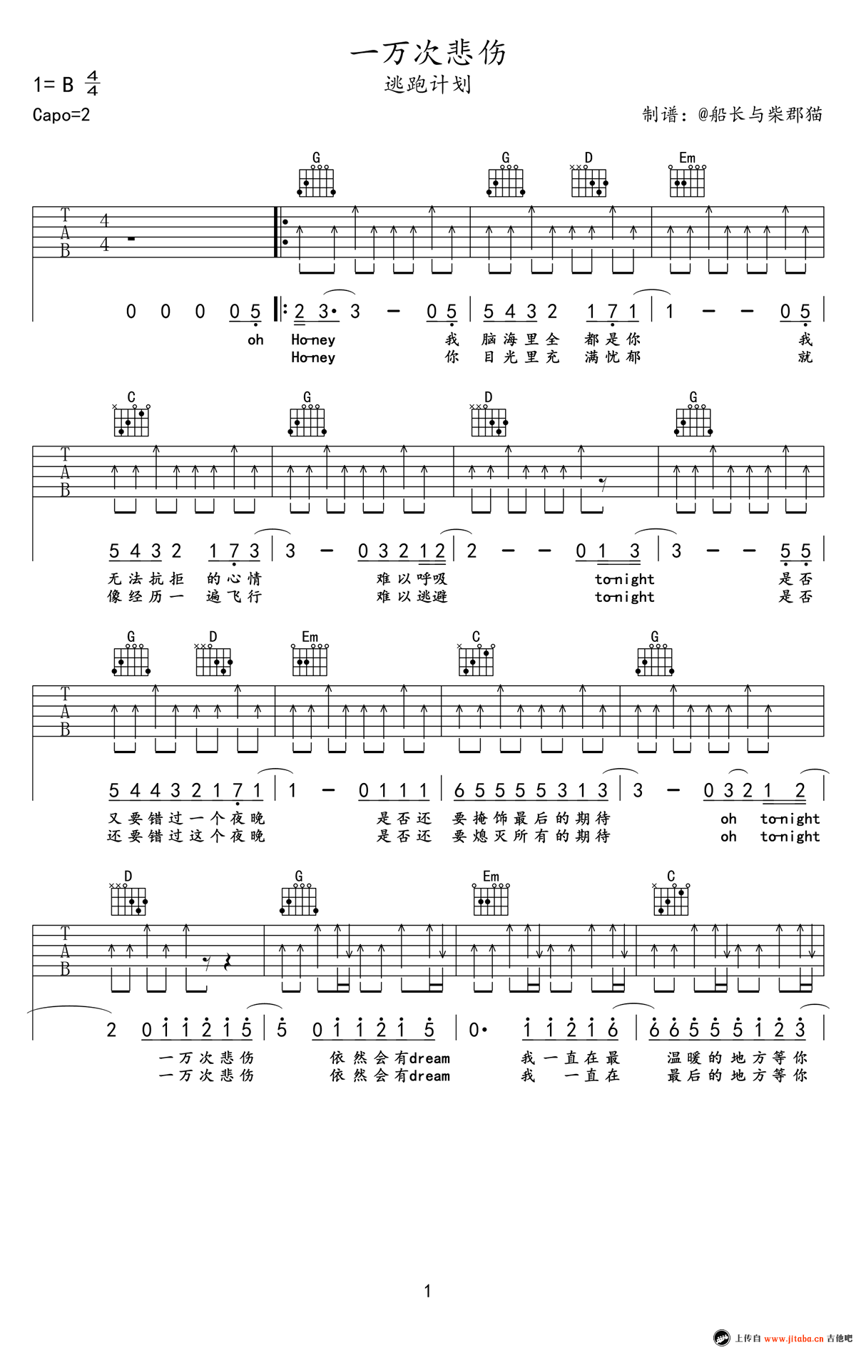 曲谱介绍: 一万次悲伤吉他谱,逃跑计划乐队演唱。一万次悲伤六线谱,变调夹夹二品。三张图片谱例,感谢船长与柴郡猫制谱,91吉他谱网站上传。