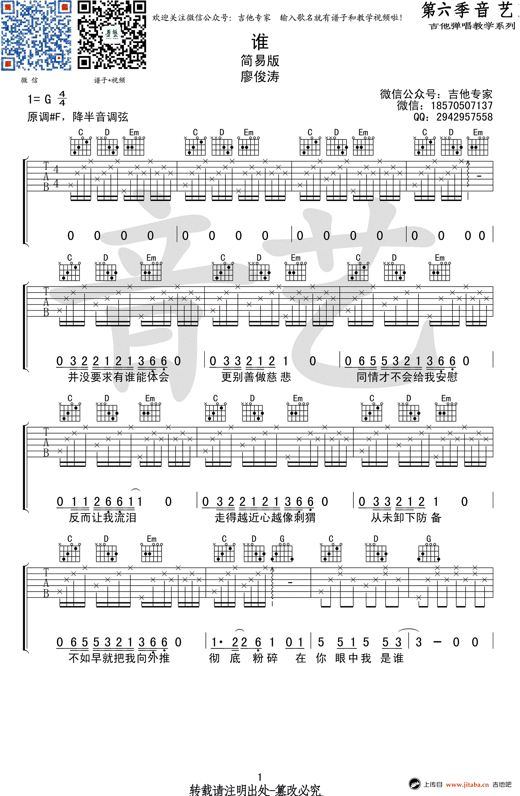 谁吉他谱 - 廖俊涛 - G调吉他弹唱谱