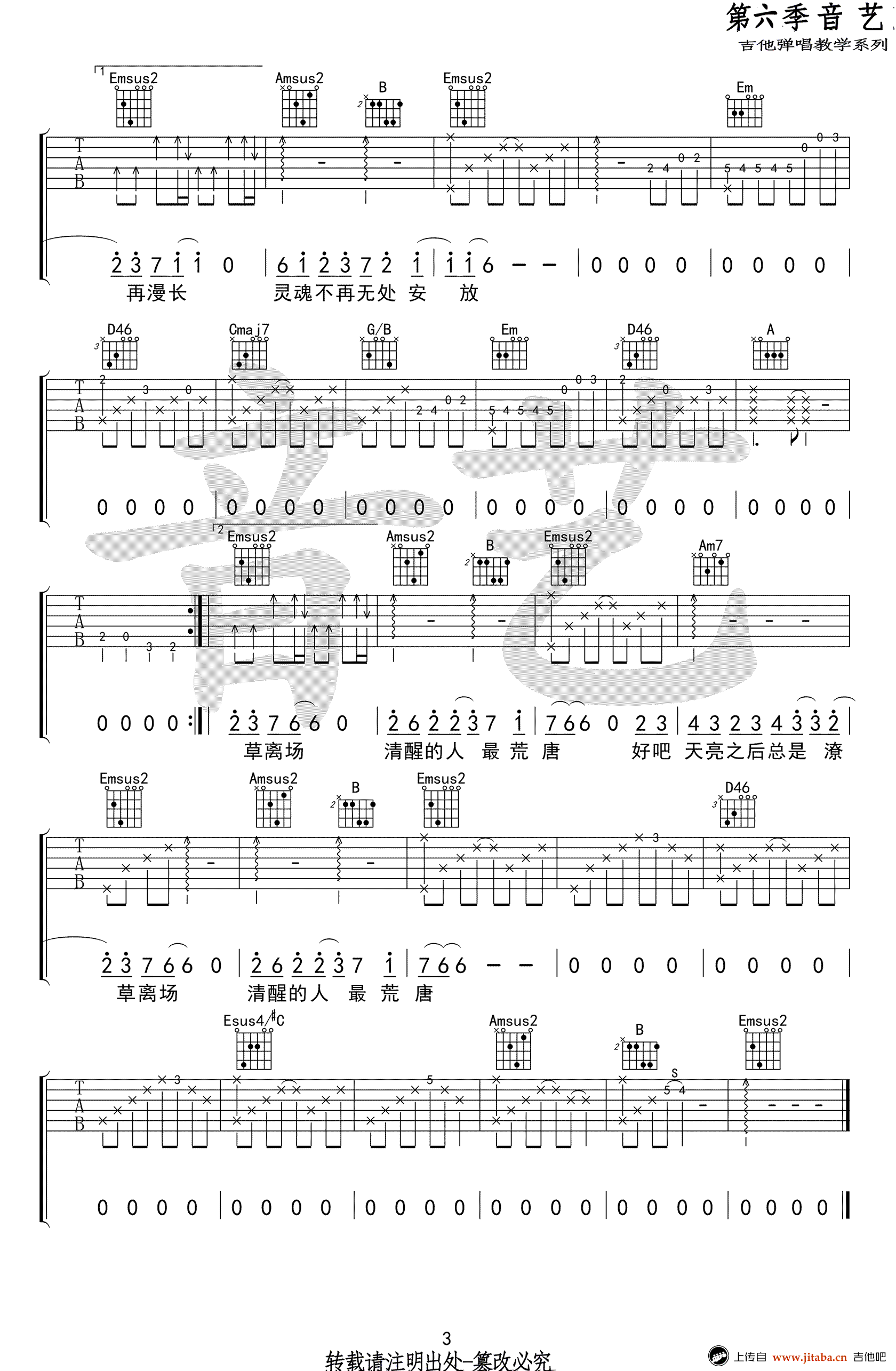 曲谱介绍: 毛不易吉他谱,毛不易演唱,《明日之子》优秀原创作品。毛不易六线谱,高清弹唱谱共三张图片。歌曲原调#G,变调夹夹第一品,选用G调指法。感谢音艺吉他编配,91吉他谱网站上传。 歌曲的和声调式编配的真心不错,大小调的转换很到位,和弦外音也有特点,所以就尽量按原版来编配的,不过来也不算难,弹不了的小伙伴可以把和弦简化,比如Emsus2就用Em。