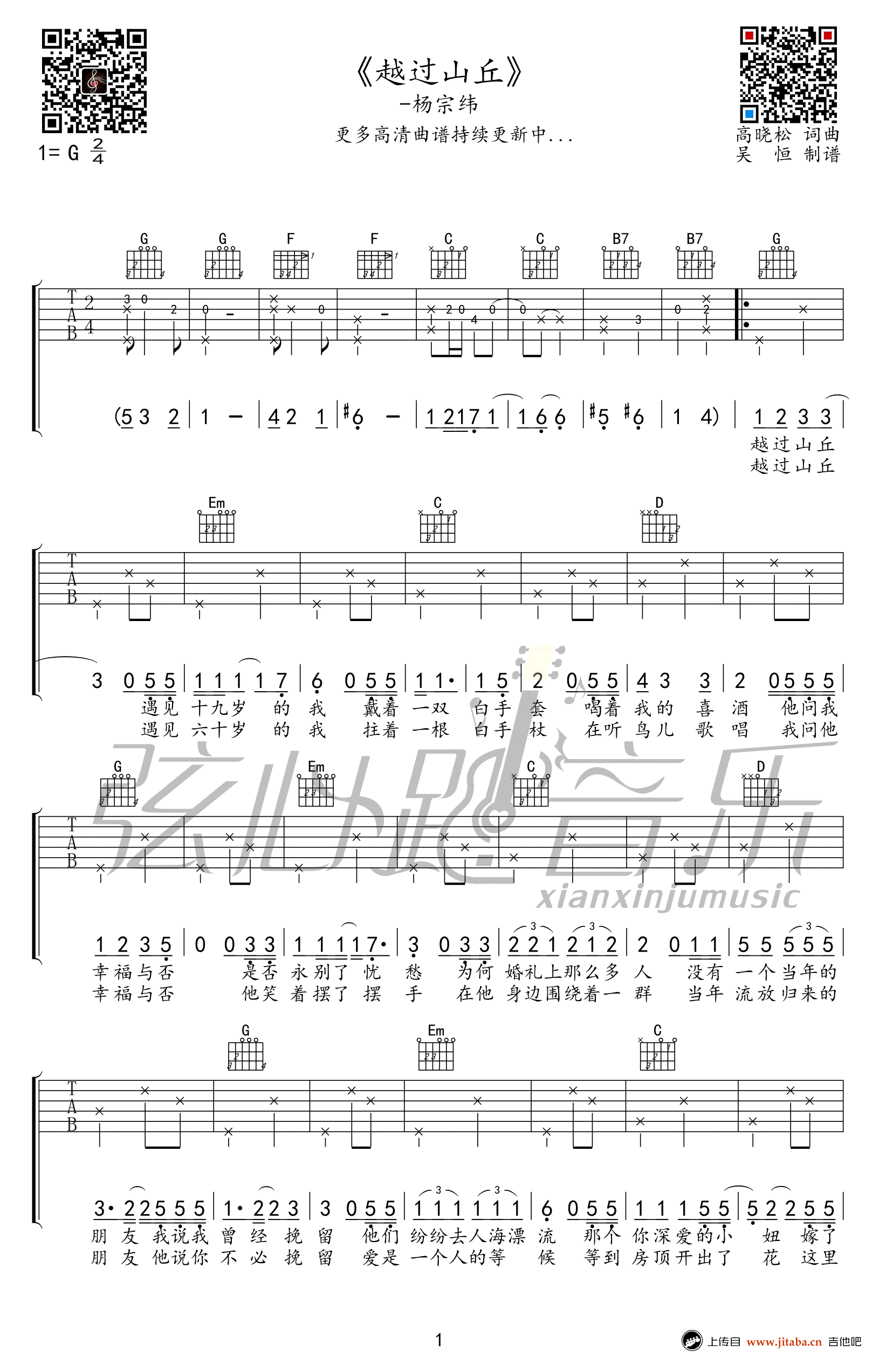 曲谱介绍: 越过山丘吉他谱,杨宗纬演唱,高晓松一首致敬李宗盛的歌曲,越过山丘吉他弹唱谱,G调指法,高清图片六线谱。感谢弦心距出品,91吉他谱网站推荐。