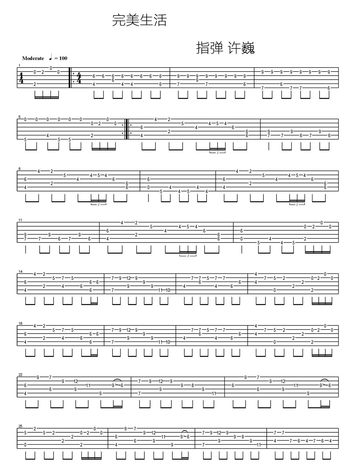 曲谱介绍: 完美生活指弹吉他谱,许巍的一首经典代表作品,完美生活吉他独奏谱,曲谱根据PDF文件转换,两张高清图片谱例。 许巍的音乐伴随着我度过青春躁动的岁月,每次听总是很有感触。像一段过往的时光,像一位老友,充满淡淡的回忆;而又充满对未来的向往,向往《完美生活》。