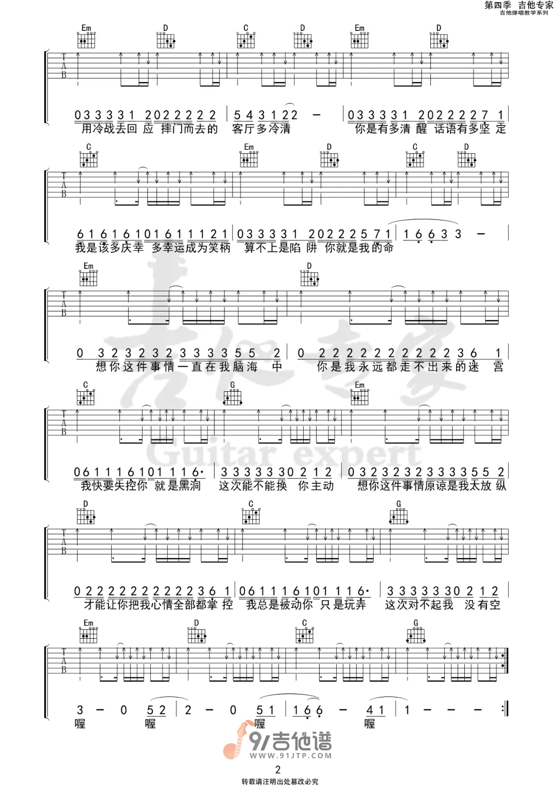 曲谱介绍: 曲谱简介:想你这件事吉他谱,许佳豪演唱的一首歌曲,4/4拍的节奏,这首歌曲的原调为A调,这里曲谱采用了G调指法进行编配,演唱时夹变调夹2品可回到原调,也可根据个人实际嗓音情况选择。曲谱由吉他专家编配出品。想你这件事,是我的事情,但和你有关。黑洞是时空曲率大到光都无法从其事件视界逃脱的天体,而你是我的黑洞,就是表示,你是我永远都走不出来的迷宫。16岁的烟,用吉他陪你在失眠的夜里。