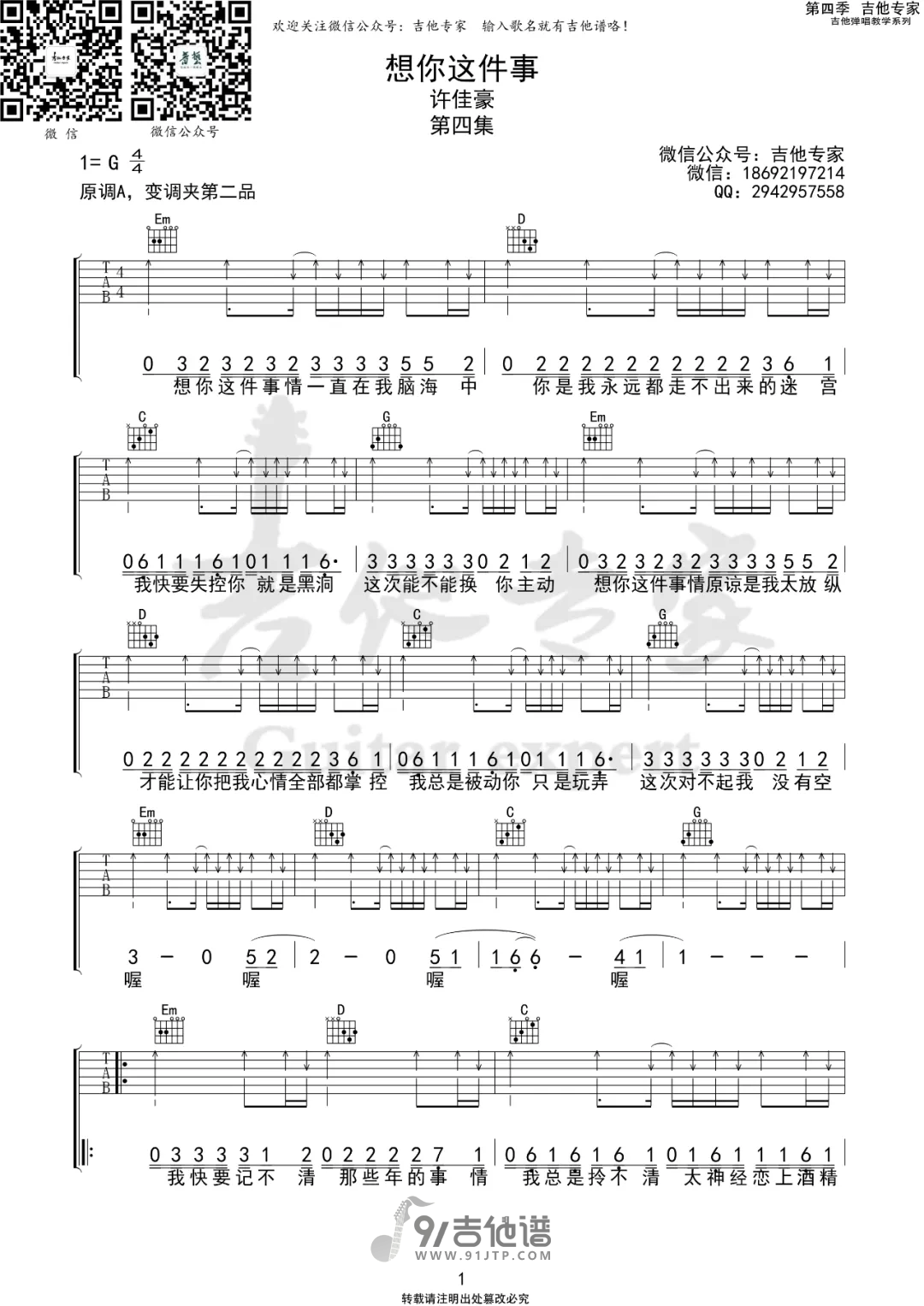 想你这件事吉他谱 - 许佳豪 - G调吉他弹唱谱 - 原版