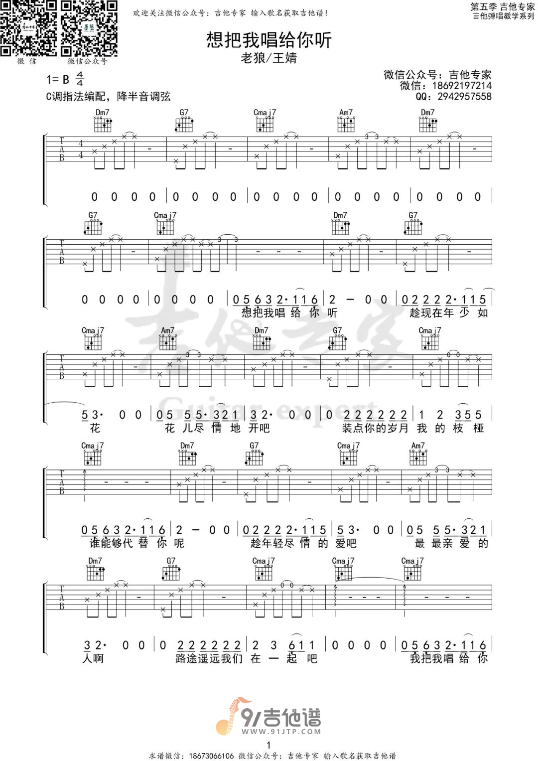 曲谱介绍: 曲谱简介:想把我唱给你听吉他谱,老狼演唱的一首歌曲,4/4拍的节奏,这首歌曲的原调为B调,这里曲谱采用了C调指法进行编配,演唱时降半音调弦可回到原调,也可根据个人实际嗓音情况选择不降音或夹几品。曲谱由吉他专家编配出品。这首歌延续了小柯一贯的细腻,从编曲到演唱都洋溢着纯真浪漫的青春气息,颇为耐听,同时这首歌也承载了莘莘学子对校园的美好回忆。