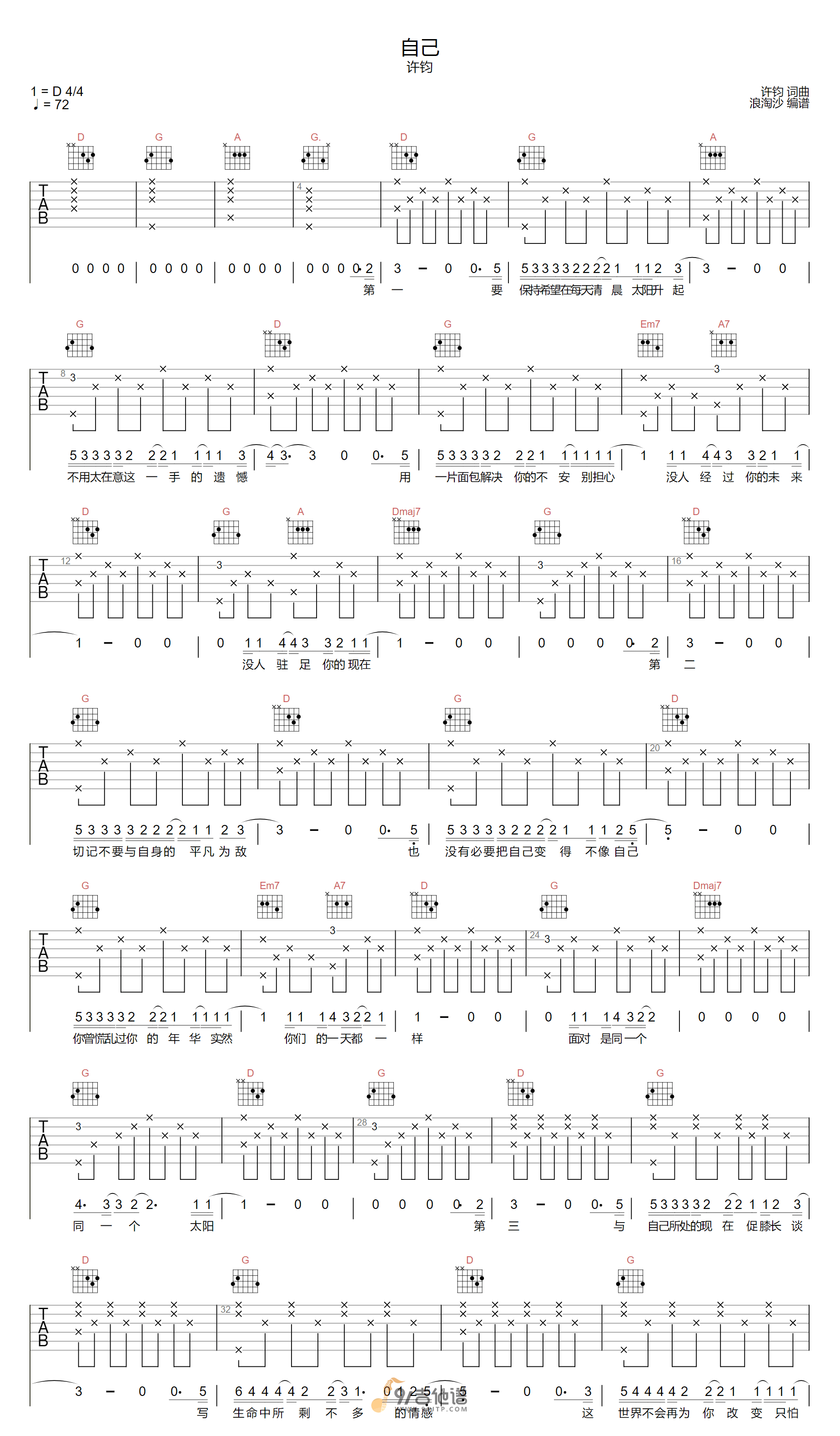 自己吉他谱 - 许钧 - D调吉他弹唱谱 - 原版