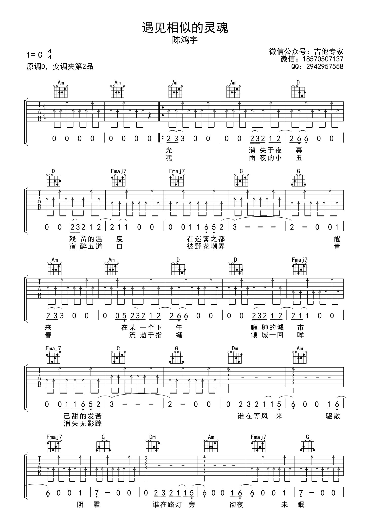 曲谱介绍: 陈鸿宇《遇见相似的灵魂》吉他谱_C调吉他弹唱谱