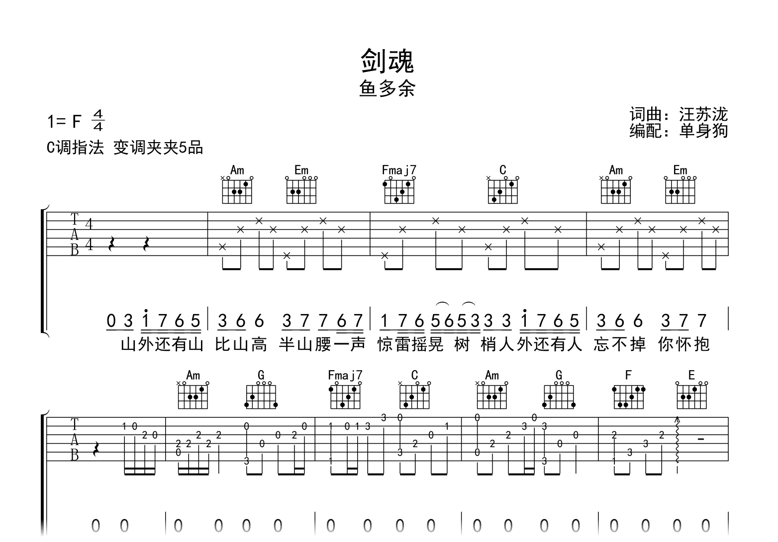 曲谱介绍: 剑魂吉他谱,鱼多余翻唱,铿锵诠释江湖情义长叹如此。《剑魂》吉他弹唱谱,原调F,选用C调指法,变调夹夹五品,完整六线谱共三张高清图片谱。 汪苏泷的一首古风歌曲,星辰变换诛仙桀骜,引无数英雄竞折腰。