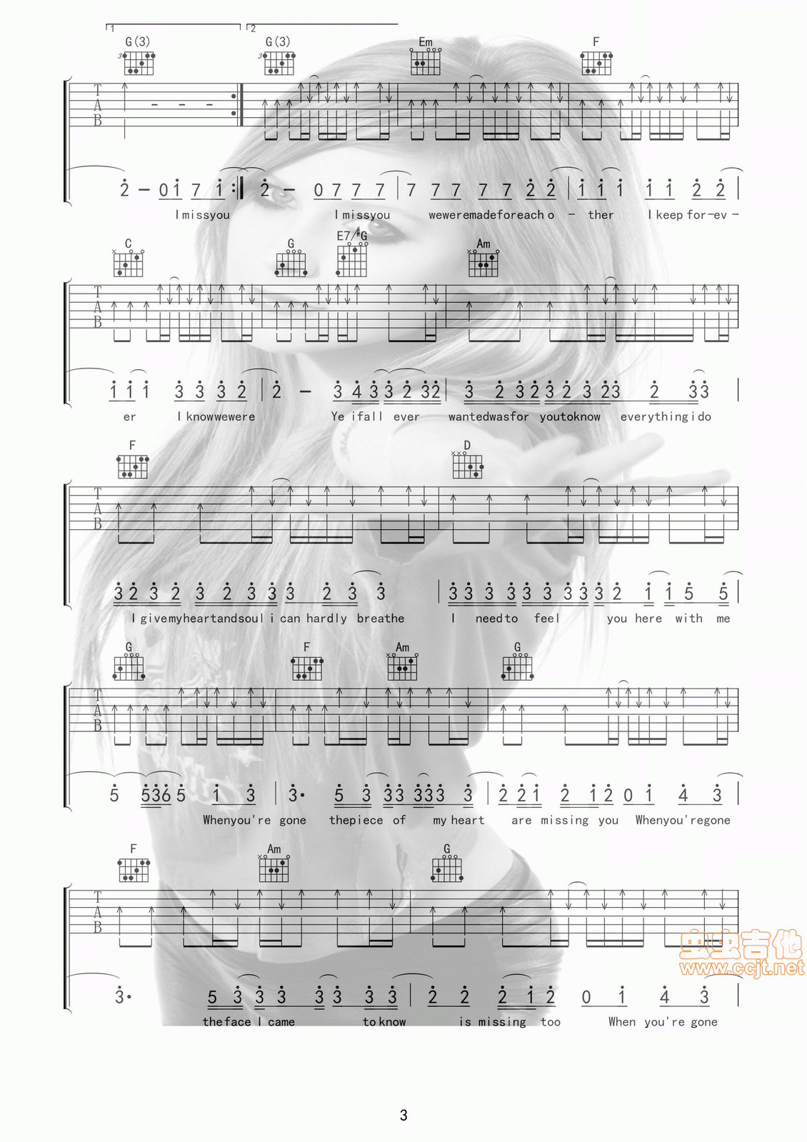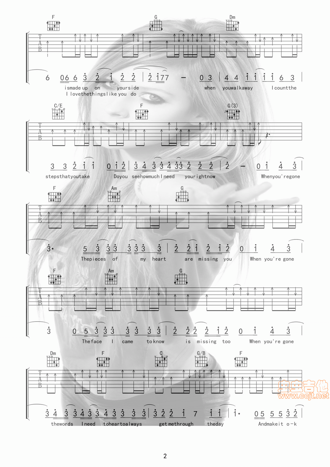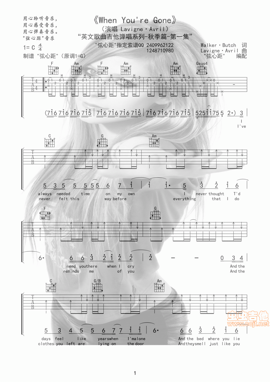 曲谱介绍: 艾薇儿《WhenYou'reGone》吉他弹唱谱,采用C调指法编配,共有4张高清图谱。