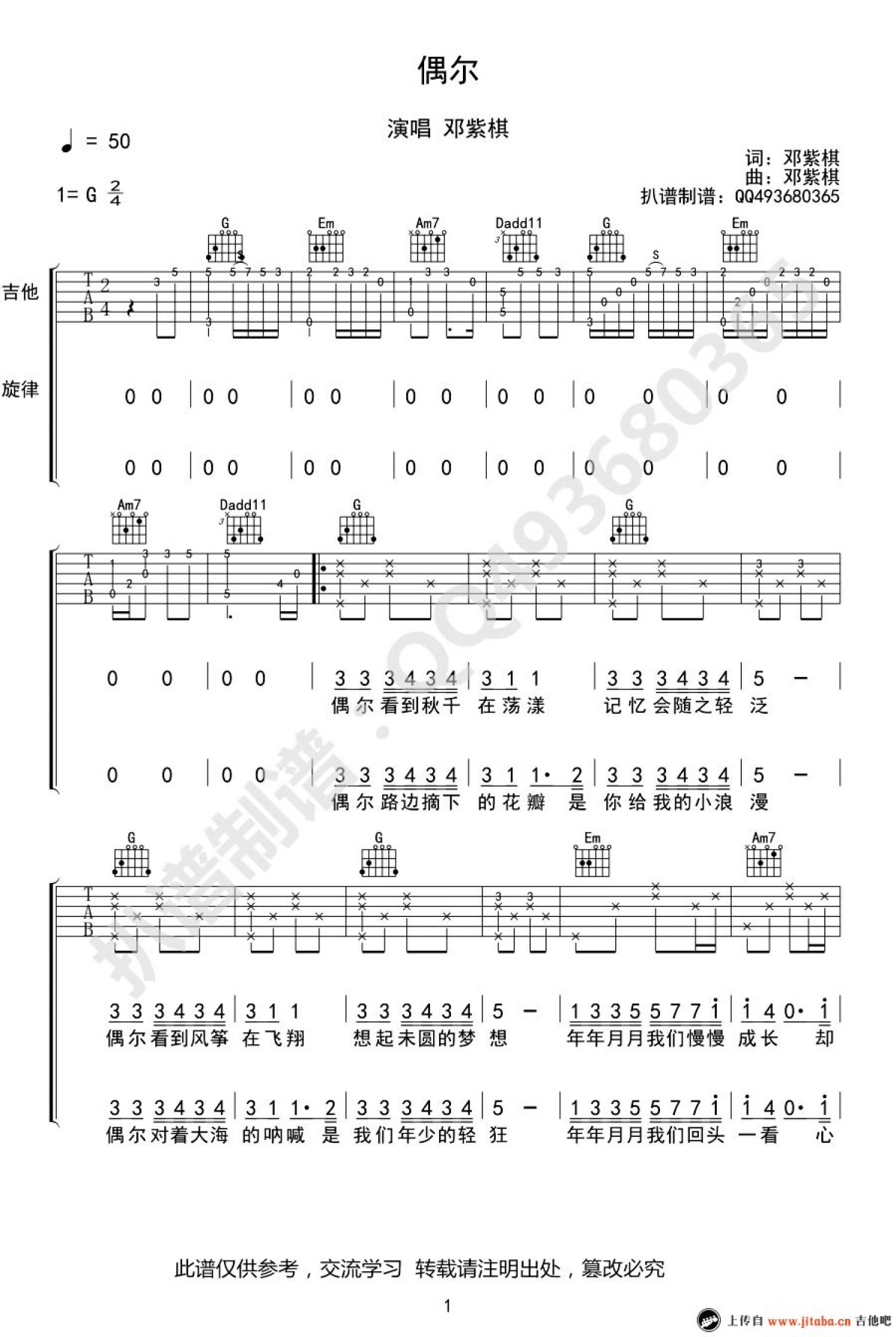 曲谱介绍: 邓紫棋《偶尔》吉他谱_G调吉他弹唱谱
